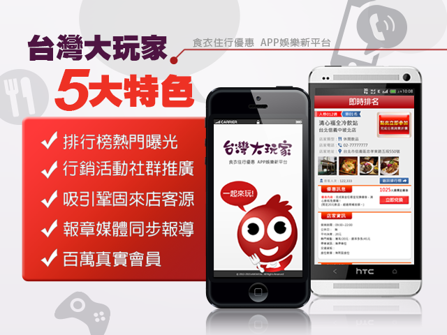 目前慶祝《台灣大玩家》APP即將二次改版,我們推出"APP免費曝光廣告專案",只要您提供獨家優惠折扣或是獨家優惠贈品,即可免費於APP內曝光,配合期為二年,此專案亦不會另外酌收其他費用!您將擁有自己的店家頁面,詳細的店家資訊和精美店家照片露出,我們也會不定期舉辦行銷活動、粉絲團每日推薦等等…..現在就立刻加入我們,讓您的店家和台灣大玩家APP一起茁壯成長!
