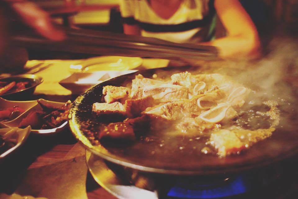 巷弄內的餐館、好康版熱銷的泡菜店家,進入剛上桌就像一般韓式餐館端出一系列的韓式小菜,樸實美味道地!點了烤帶骨牛小排,服務生在盤型的烤盤放入肉塊,卻又倒入許多醬汁蓋過肉塊⋯⋯跟正常印象中的烤肉不一樣!?