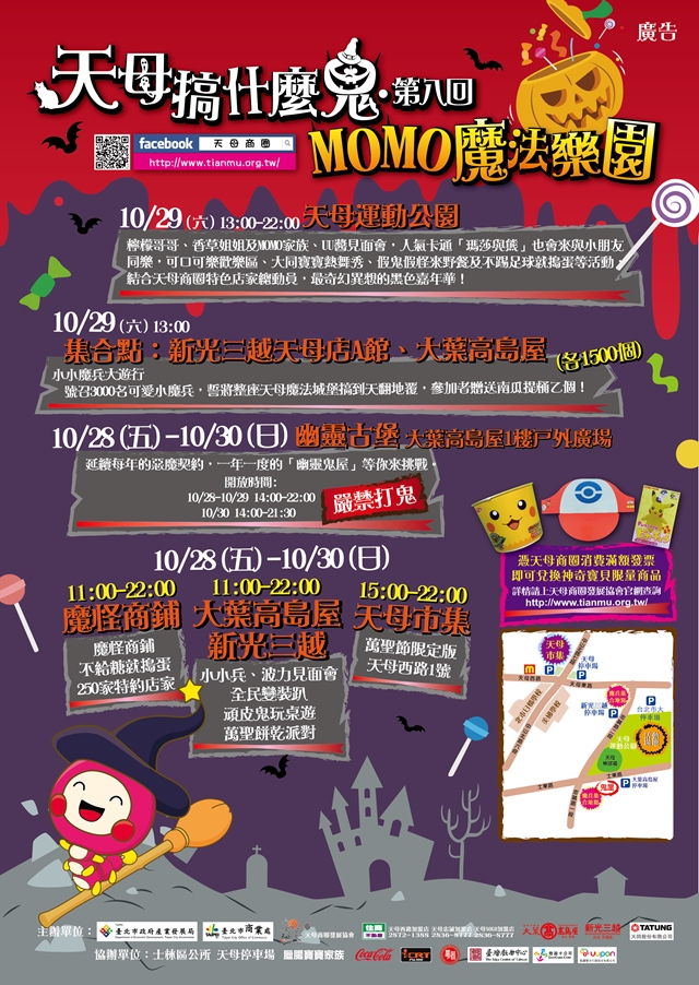 10/28(六)當日並結合天母商圈特色店家總動員,超過40家特色店家參與,超擬真恐怖珍饌、超驚嚇萬聖節限定商品,此外現場並有瑪莎與熊卡通人偶見面會、大同寶寶熱舞秀及神奇寶貝限定商品免費發送。