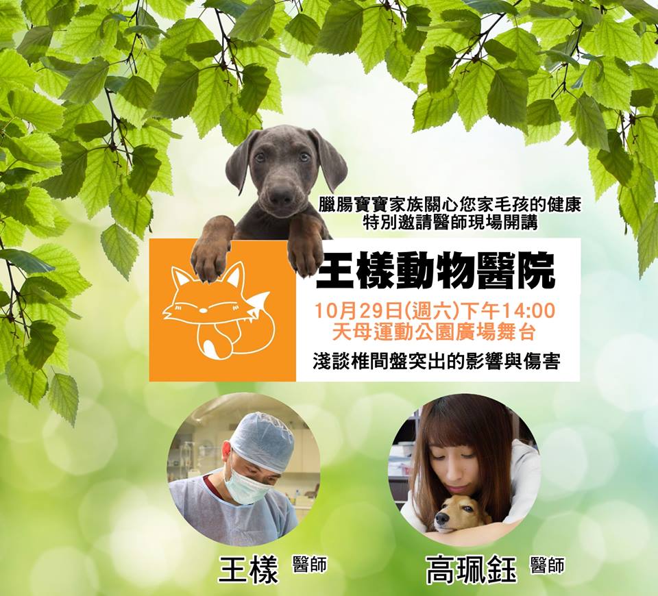10月29日(週六)下午13:00於天母大葉高島屋集合14:00於天母運動公園廣場舞台舉辦活動,臘腸寶寶家族關心您家毛孩的健康,特別邀請王樣動物醫院王樣醫師,高珮鈺醫師親臨現場開講,淺談椎間盤突出的影響與傷害,歡迎大家踴躍前往,共襄盛舉。