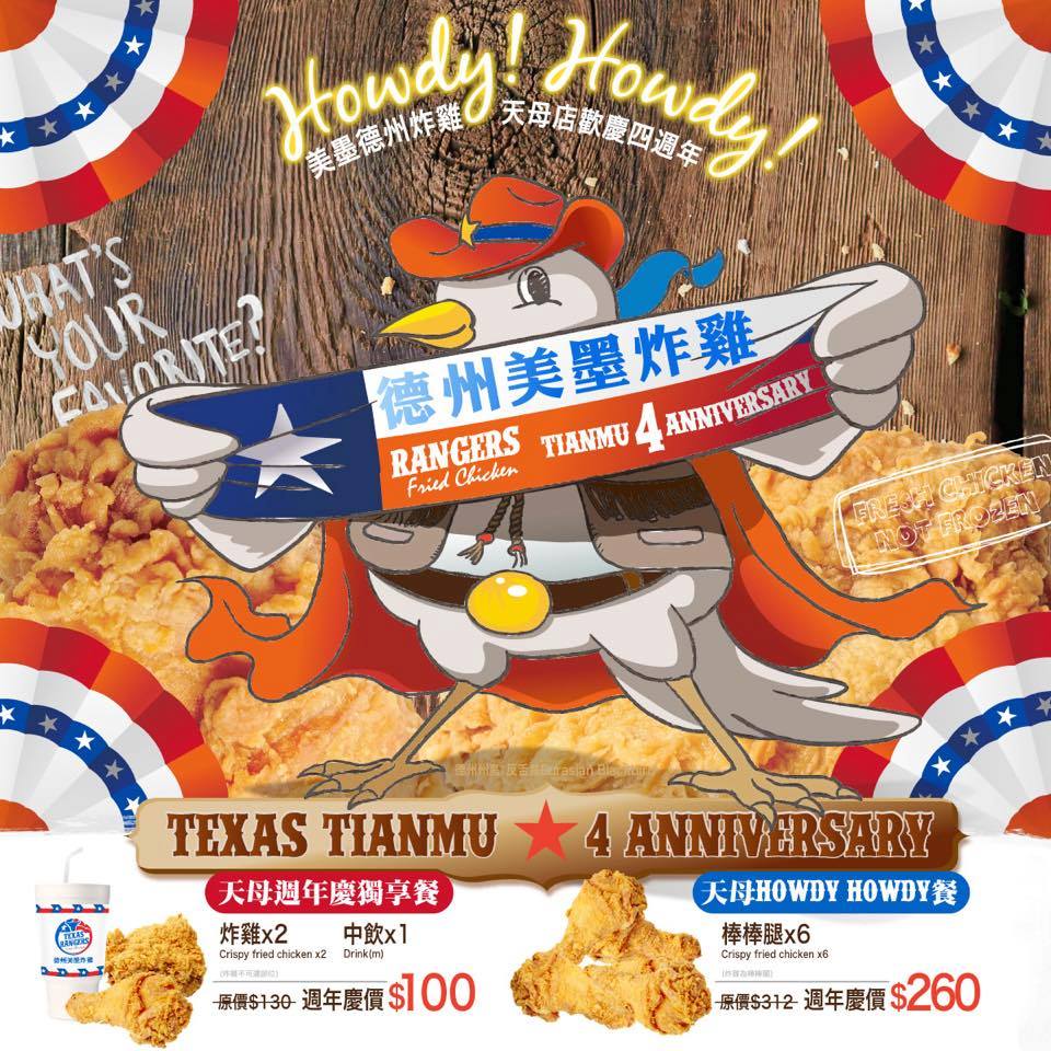 另外先來個下馬威德州美墨炸雞天母店滿4歲囉週年慶回饋4/11開跑4/11-4/30止(此優惠活動限天母店)
