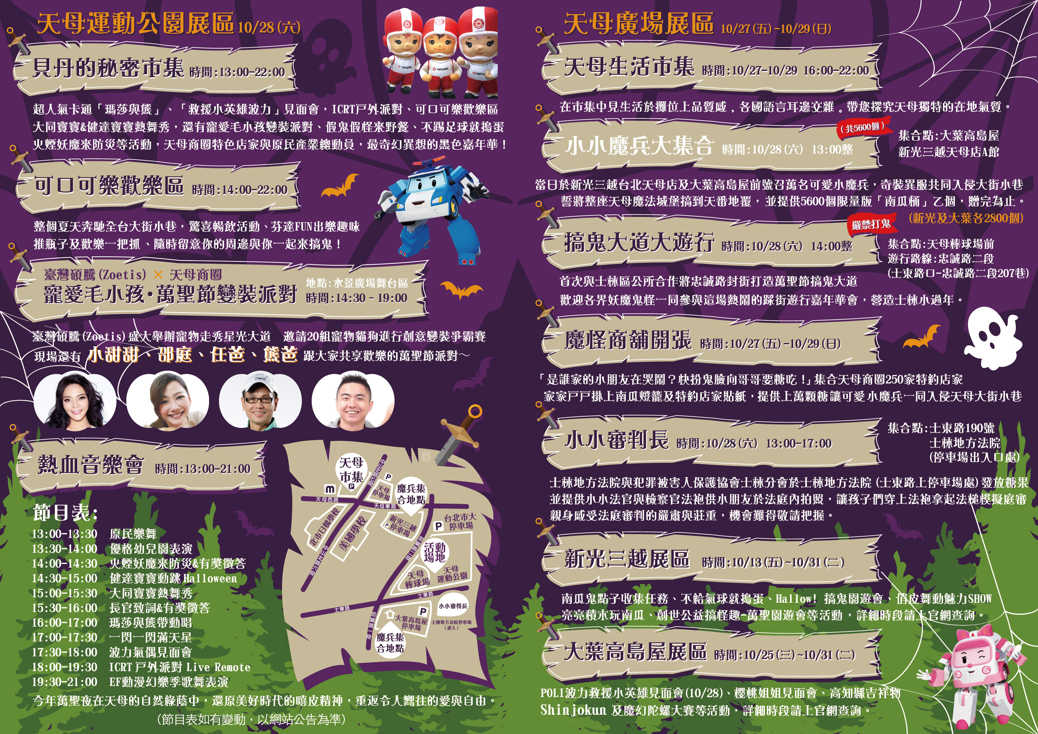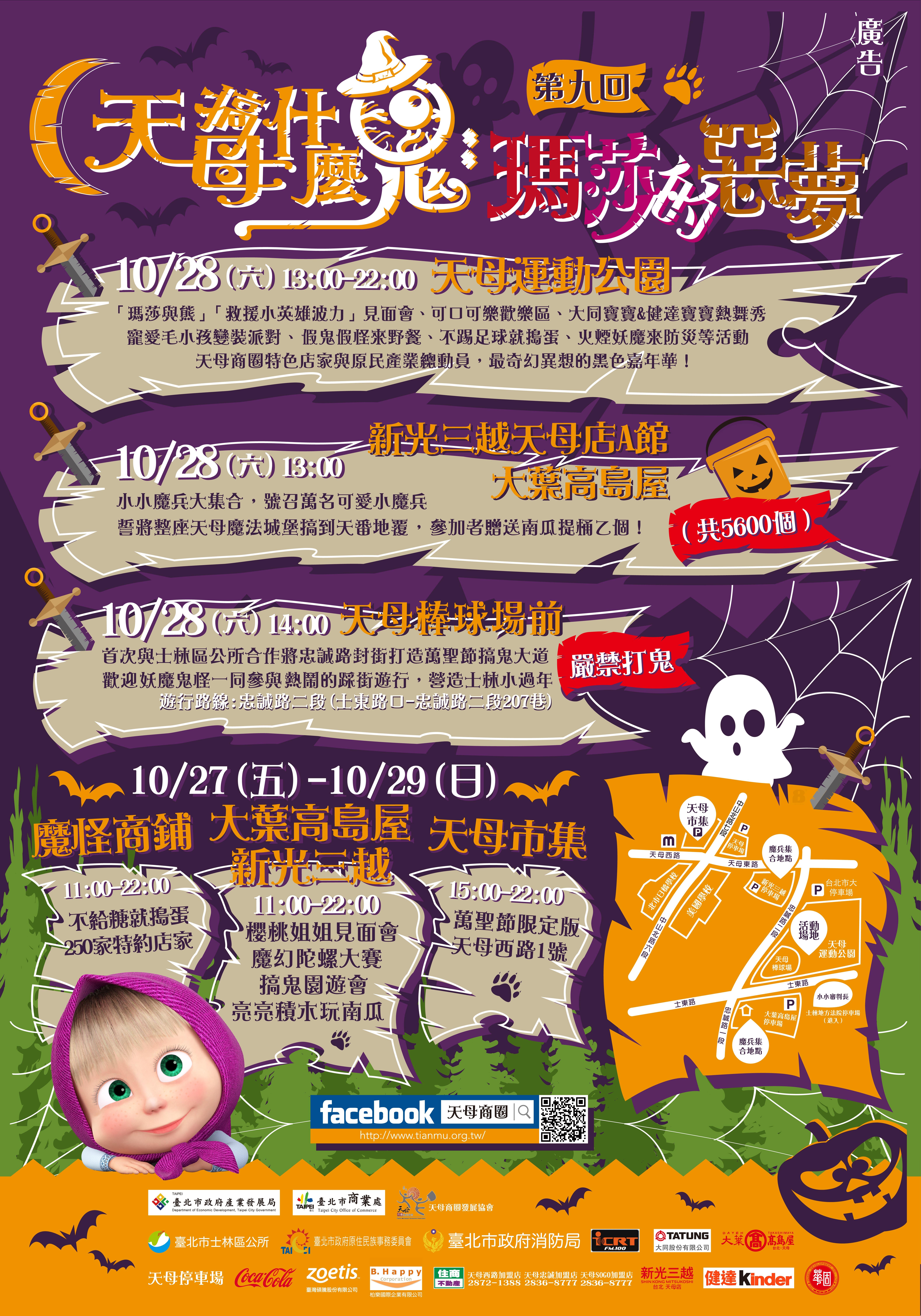 10/28(六)當日並結合天母商圈特色店家總動員,超過40家特色店家參與,超擬真恐怖珍饌、超驚嚇萬聖節限定商品,此外現場並有瑪莎與熊卡通人偶見面會、大同寶寶熱舞秀及有獎徵答贈品免費發送。