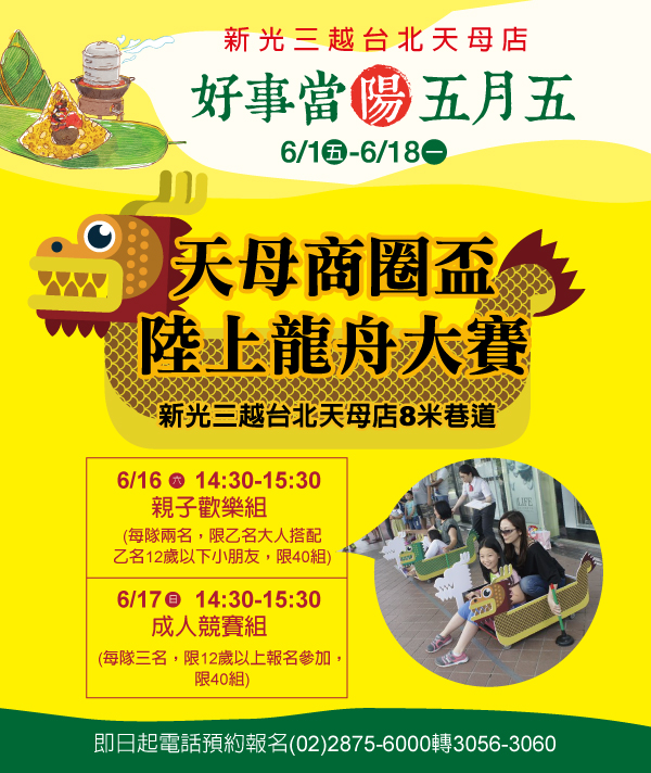 一年一度的陸上龍舟大賽又來囉~本次新光三越台北天母店將特別與天母商圈合作封街擴大舉辦陸上龍舟大賽,將為大人以及小朋友量身打造賽程,即日起開放報名,現場有多項贈品等你領取喔~~