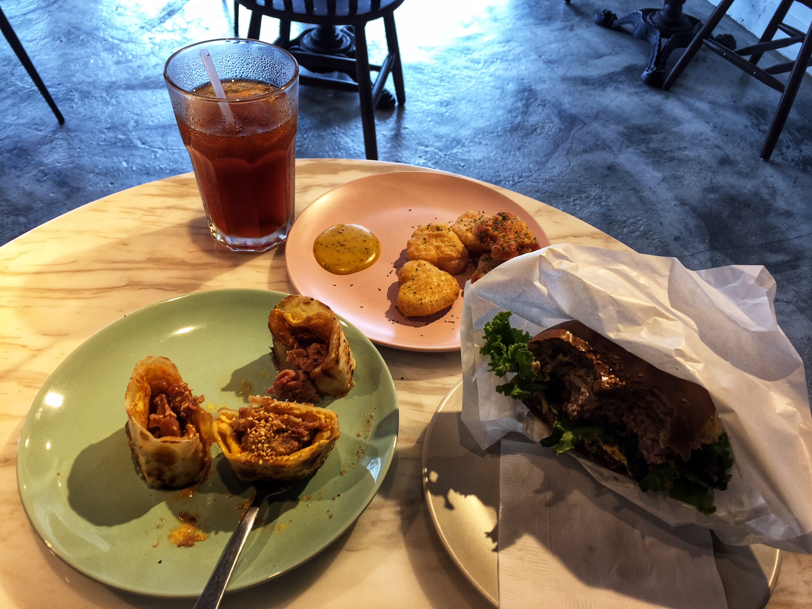 菜單品項不多,但編仔認為這沒什麼,只要把有把握的餐點做好一樣可以發揚光大,點了起司醬牛漢堡+起司蛋跟薑燒豬蛋餅,餐點果然沒有令人失望,蛋餅煎的酥脆,豬肉厚實薑味濃,雖要價70元但份量不少肉也鋪的滿滿的,漢堡裡面是1/4盎司的厚牛肉,一口咬下去肉汁馬上從旁邊流出來,夾雜大量的蔬菜我認為很可以,一點完全都不會讓人感到油膩,搭配點綴的剛剛好。
