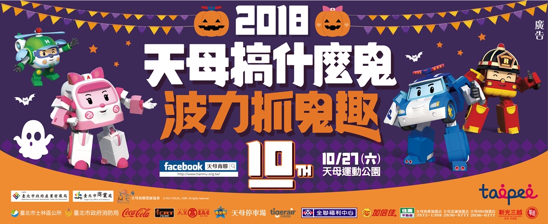 10/27(六)當日並結合天母商圈特色店家總動員,超過50家特色店家參與,超擬真恐怖珍饌、超驚嚇萬聖節限定商品,並有卡通「救援小英雄波力」人偶見面會,波力、羅伊、安寶、赫利四位卡通人物難得合體與小朋友唱跳,此外還有ICRT鬼王鬼后大PK、 EF動漫幻樂季及有獎徵答等多項活動。
