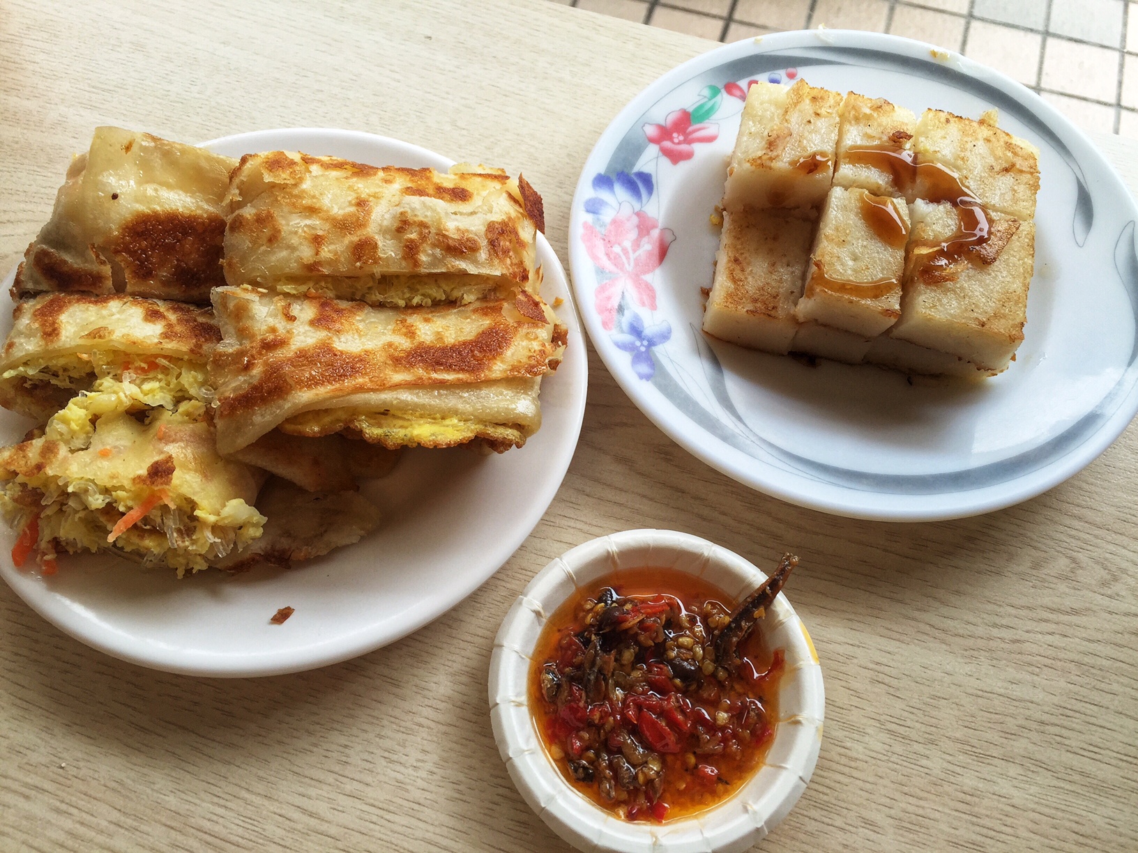 內餡高麗菜夾雜紅蘿蔔及粉絲,手桿餅皮煎的酥脆,讓你可以吃的出層次感,蘿蔔糕也煎的不錯,搭配一圈的醬油膏入口綿綿含有淡淡的白蘿蔔味。