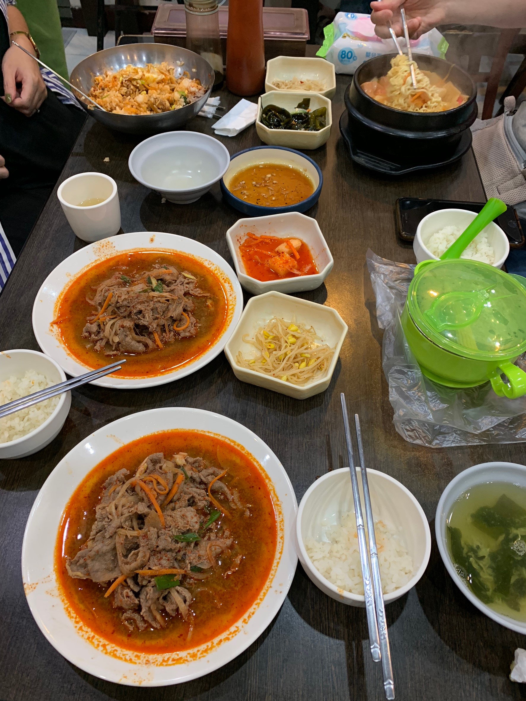 小菜、白飯可以續一次,因為我們喜歡吃辣,所以請店家幫我們烤肉飯加辣,看起來是紅紅的是不是又更可口了呢,海鮮煎餅一定要點,個人部隊鍋也不錯,在此分享給大家囉。