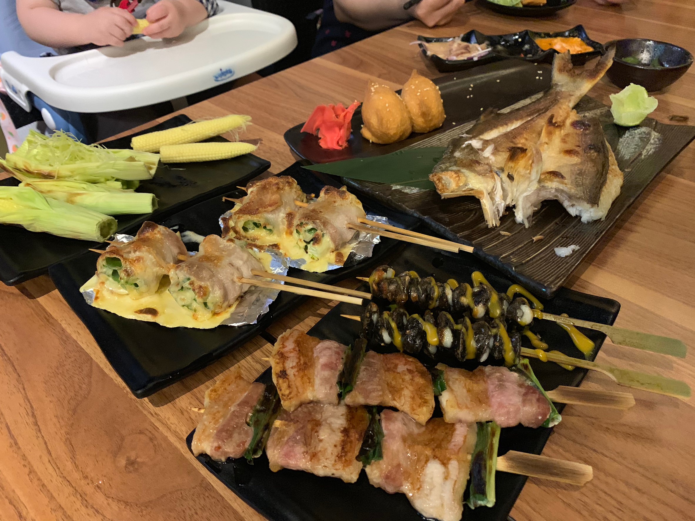 老闆推薦吧檯上掛著的午仔魚,他說這都是當日處理,很新鮮沒有腥味,串燒大多都是銅板價,像這一餐四個人點了一大桌,可能因為沒喝酒的關係,吃下來大約1800元,誰說來居酒屋就一定要喝酒呢,吃吃串燒也很棒呢~