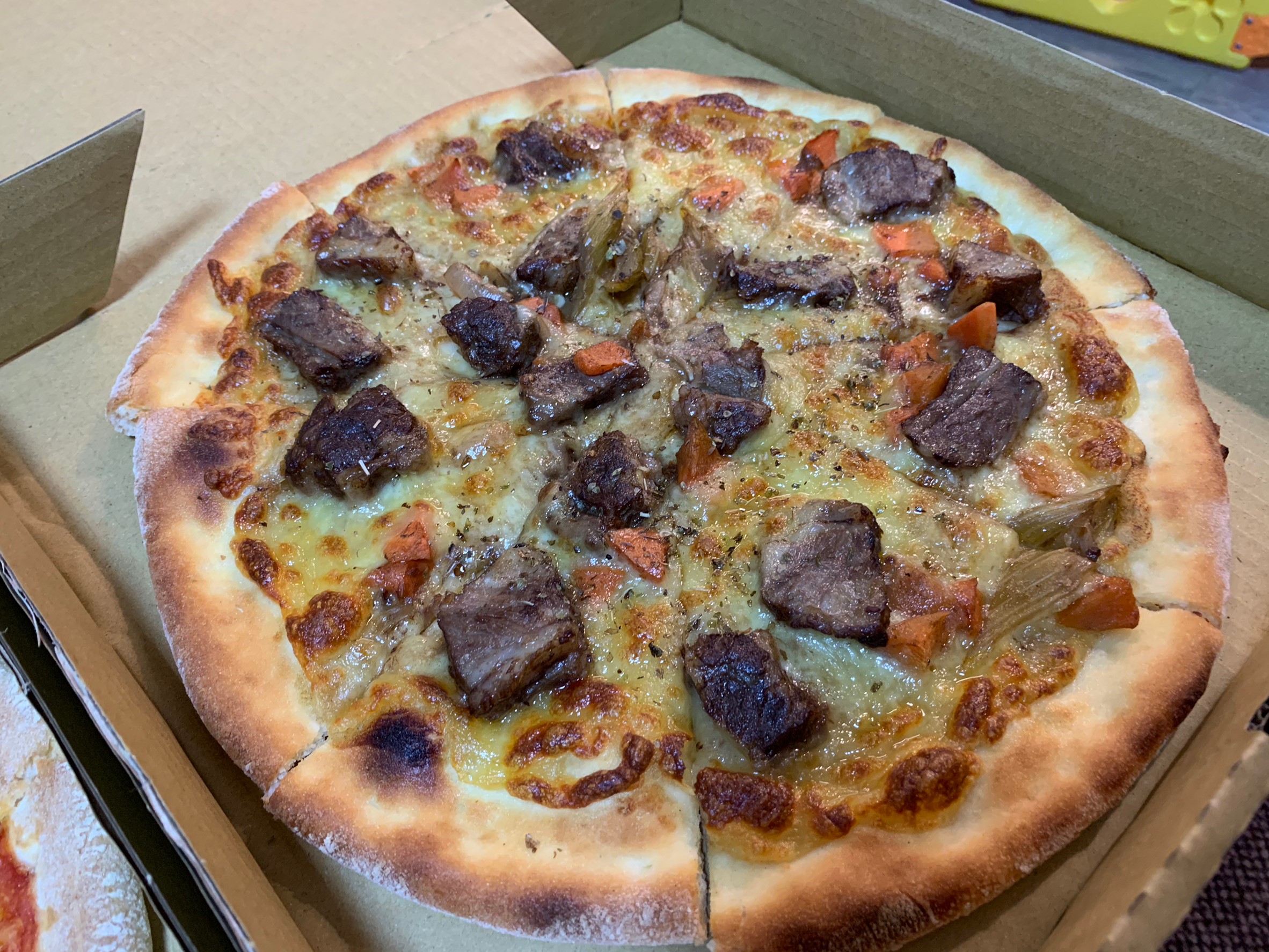 特別是新口味紅酒燉牛肋條披薩,很受大家親睞,每個披薩還會送一罐汽水呢~