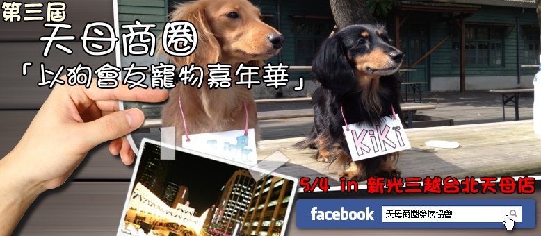 天母地區飼養寵物的民眾非常的多,相對寵物相關業種的店家比利也相對較高,天母商圈發展協會將於5/4星期日於新光三越台北天母店前廣場,以動物為主題發起舉辦第三屆「以狗會友」活動,以往第一、二屆天母商圈寵物嘉年華每屆吸引將近三千人參與活動,現場非常熱鬧,希望藉由這樣的活動號召大台北地區的民眾攜帶寵物共同參與。