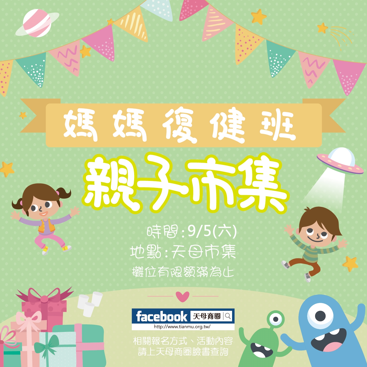 參加資格:攤位上需有13歲以下小朋友陪同擺攤,攤位商品必須2/3為親子相關商品,否則贈品取消