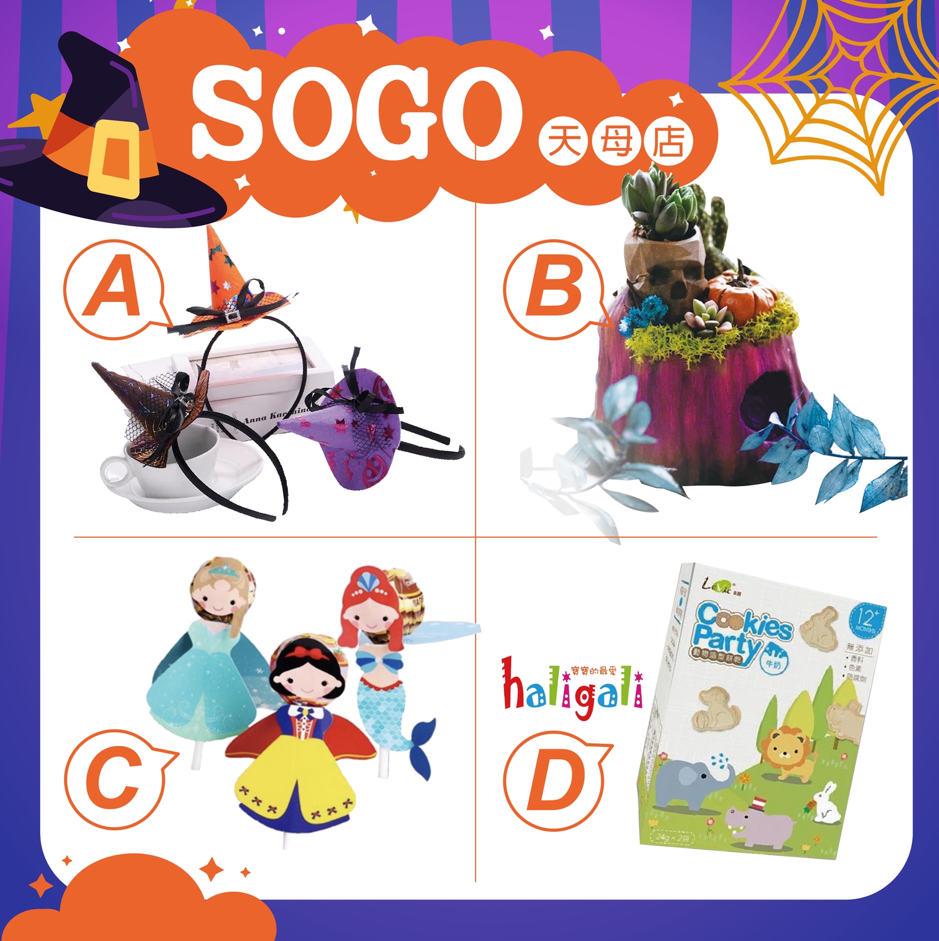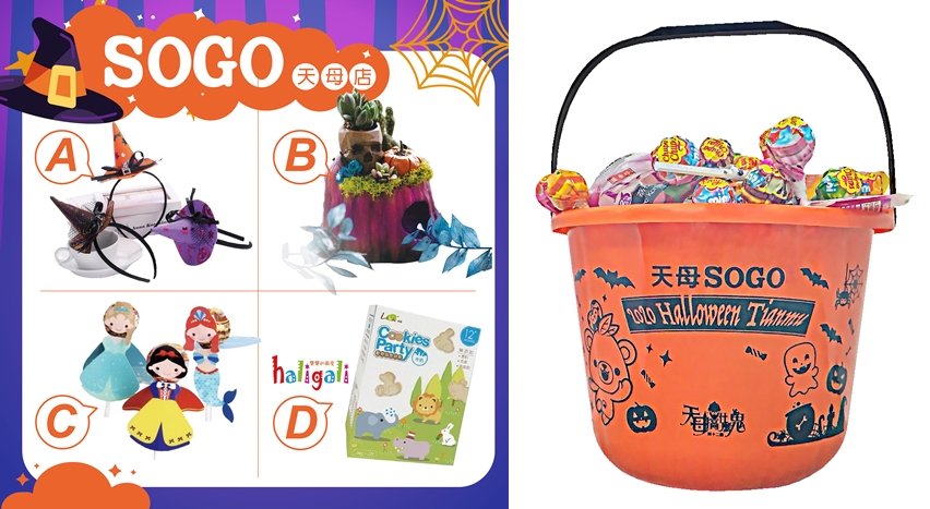 活動期間至7F萬聖節活動背版拍照打卡於天母SOGO Facebook粉絲專頁,並hashtag#天母SOGO萬聖PARTY在7樓,即可得萬聖節精美糖果壹份。(壹份2枝,限量50份)。