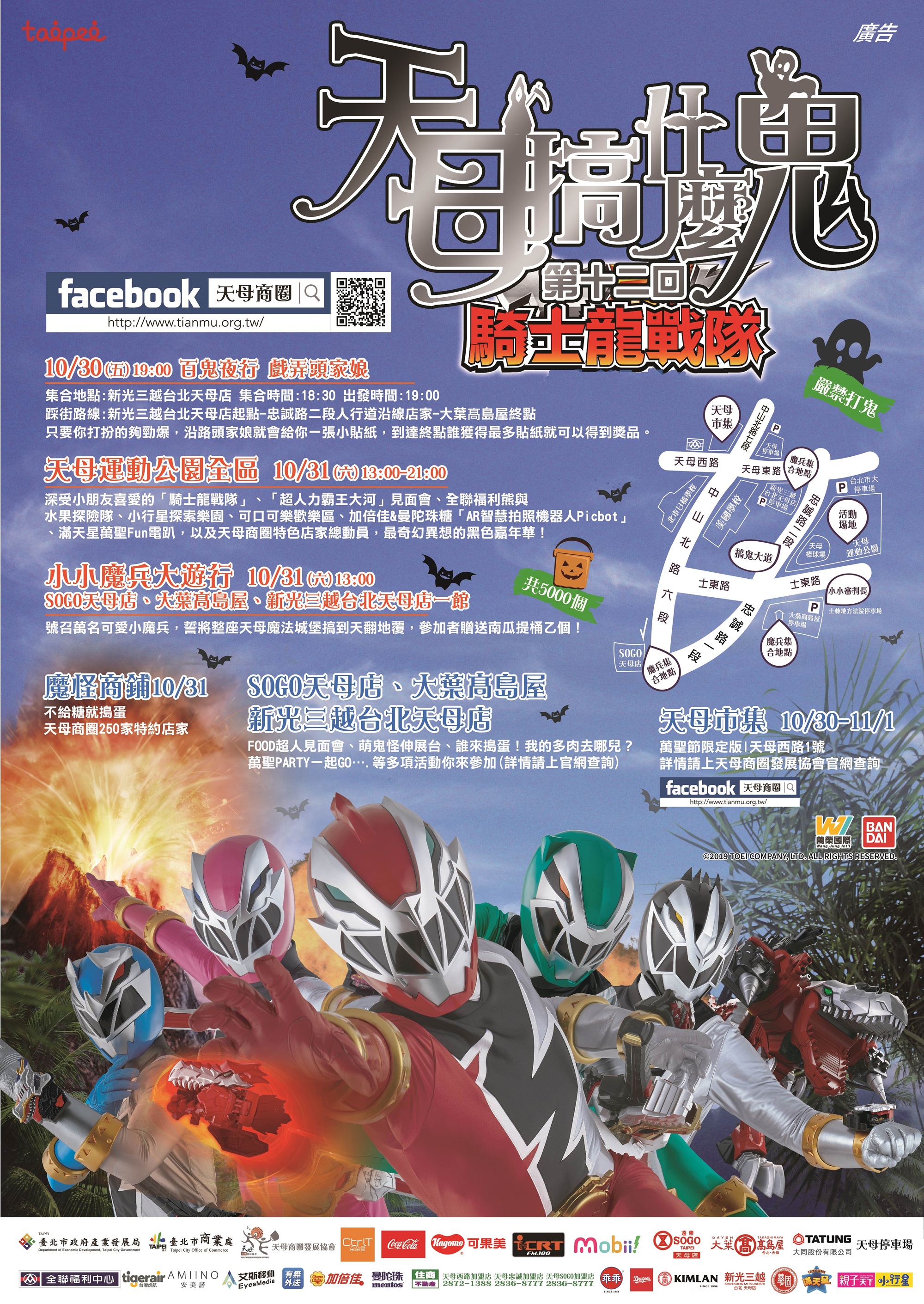 今年邁入第12屆的天母搞什麼鬼活動,由10/30(五)百鬼夜行踩街大鬧天母城打頭陣,天母國小管樂團吹奏幽靈音樂領頭,四方妖魔鬼怪吉祥物和民眾與鬼同行,10/31(六)活動現場邀請深受小朋友喜愛的日本「騎士龍戰隊」和「超人力霸王大河」見面會,打造專屬搞鬼大道,四方妖魔鬼怪齊聚忠誠路大鬧天母城,一同享用魔鬼套餐忘情水、一年一次相聚闔家歡樂話家常。
