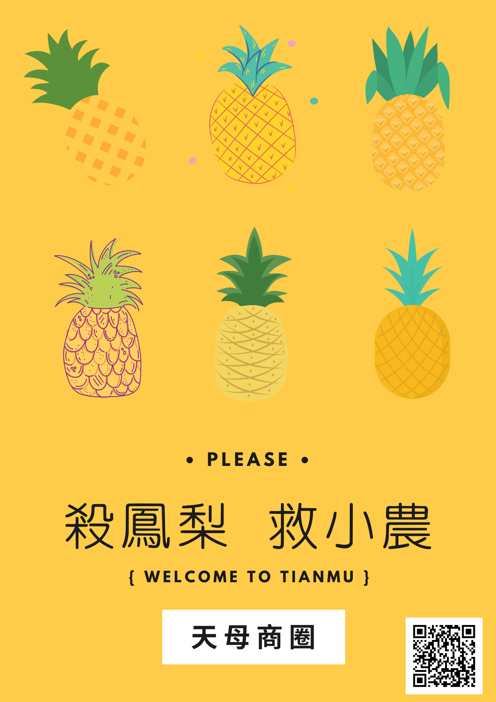 有鑑於中國暫緩進口台灣鳳梨一案,恐衝擊農民生計,天母商圈配合政府相關政策,除了店家、居民團購鳳梨外,商圈協會整合商圈內店家,紛紛推出鳳梨週邊相關商品,包括天母知名甜點店推出限定鳳梨塔、鳳梨派,咖啡店推出創意鳳梨藍莓果汁、鳳梨奶昔,餐廳則推出鹹鳳梨醬蒸魚、沃田鳳梨辦桌料理,冰品店推出鳳梨限定冰淇淋、蜜鳳梨等,甚至來店用餐就請你吃鳳梨,還可以把整隻鳳梨帶回家。