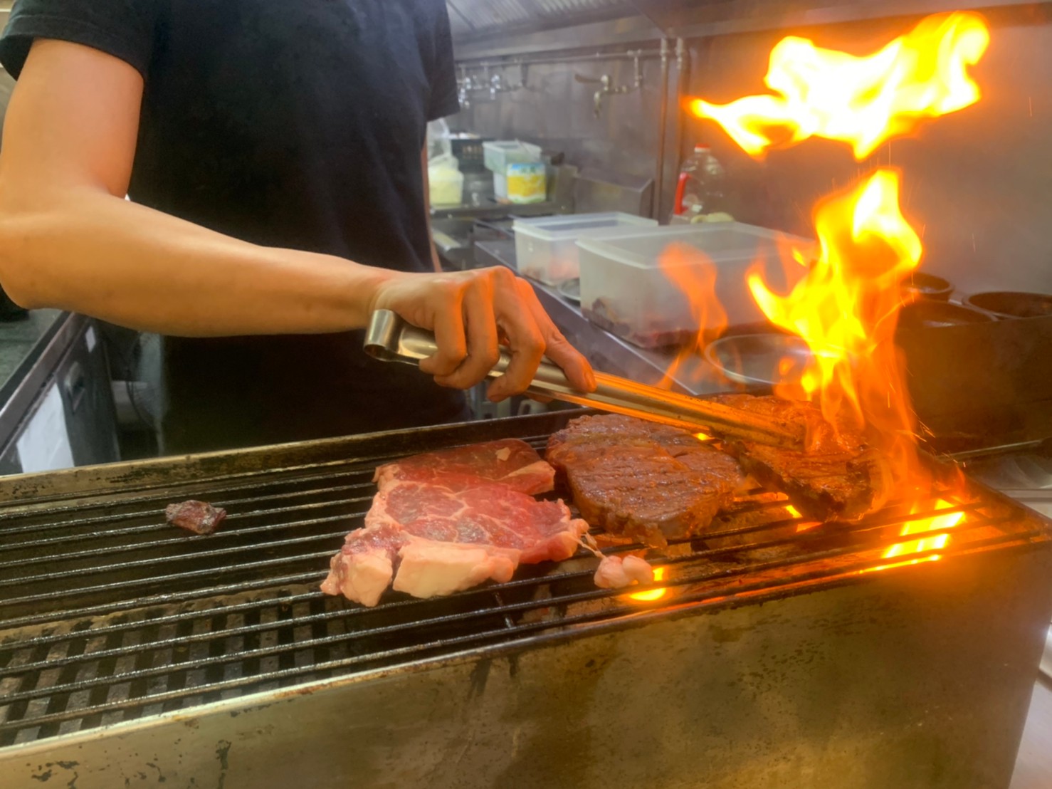 一開始還以為只是普通的牛排店,到現場才發現他的牛排都是用炭火炭烤的,不銹鋼的長條鐵盧裡面放著木炭,新鮮的牛排鋪上現烤,鮮嫩多肉汁滴下接觸炭火火苗立即竄起,趁著大夥反覆炭烤,沒多久隨著吱吱作響的鐵板加上一顆蛋就出爐了。