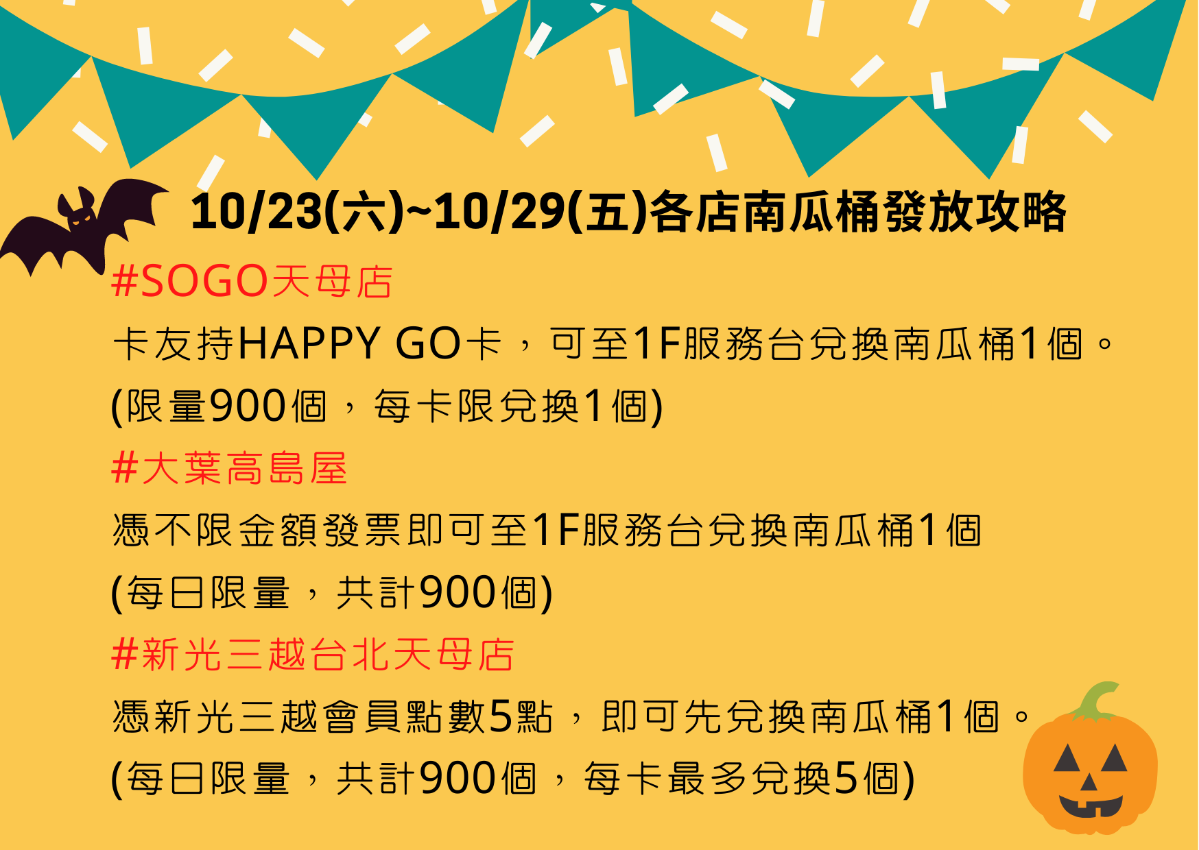 今年度因疫情關係,特此增加發放方式,上述時間SOGO天母店、大葉高島屋、新光三越天母店A館各將發出900個南瓜桶,詳情請參考圖示說明。