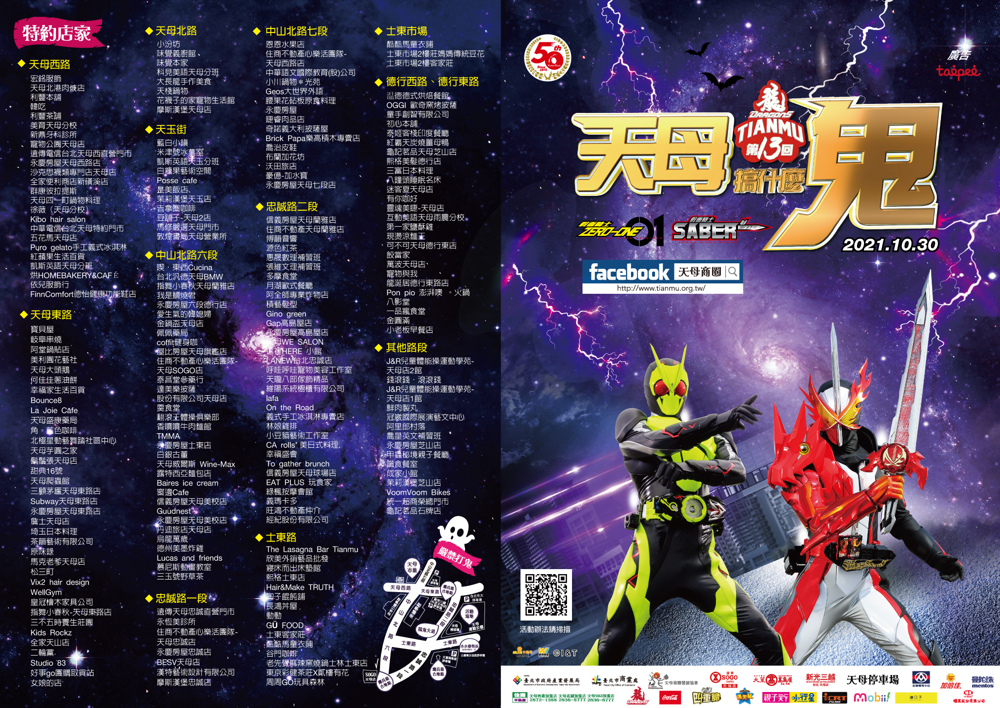 活動說明:於天母商圈招募250家要糖特約店家,並且發給辨別南瓜燈籠及特約店家貼紙,店家提供糖果給與當日參與遊行民眾要糖,並且列印特約店家要糖地圖、導覽地圖。