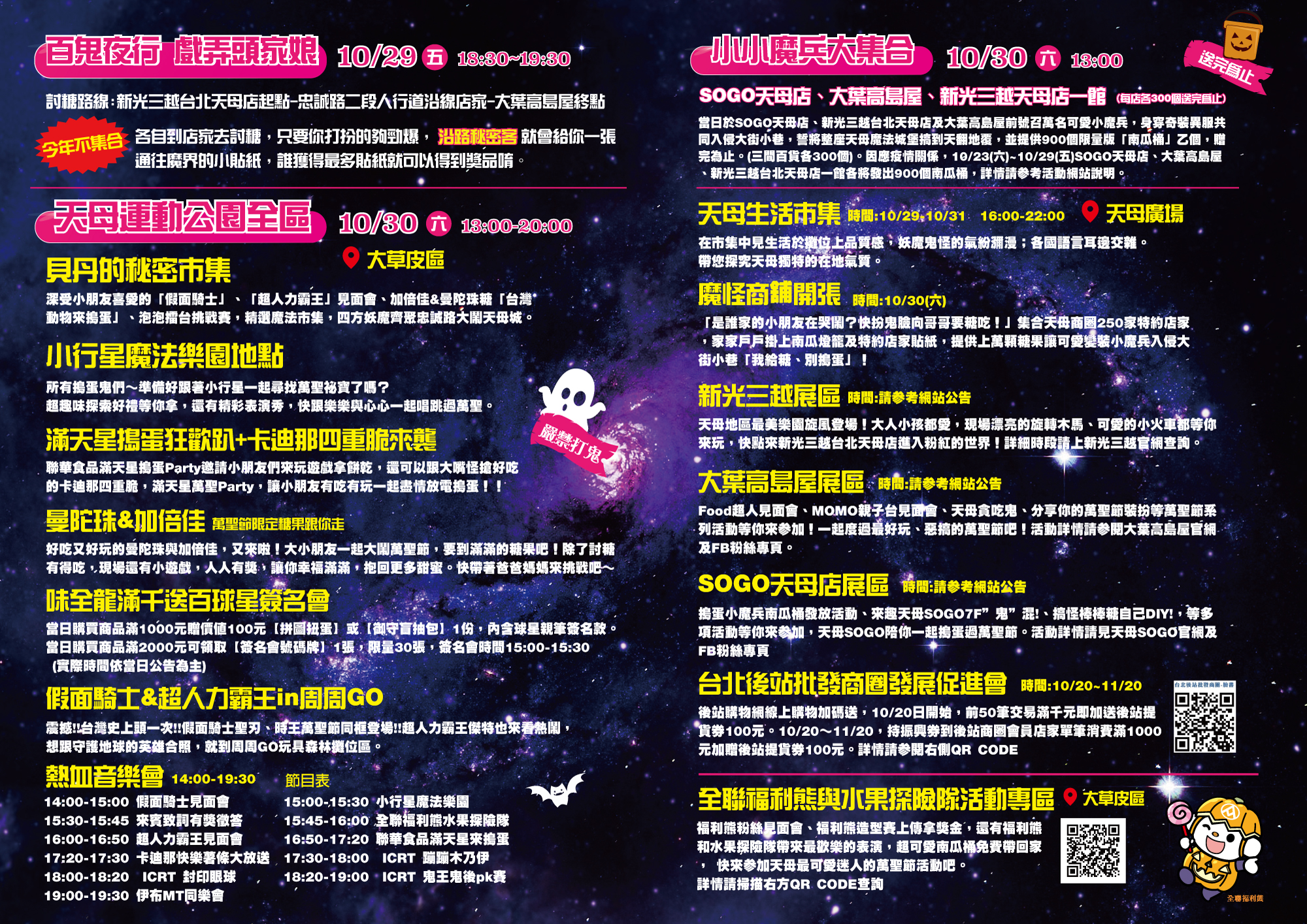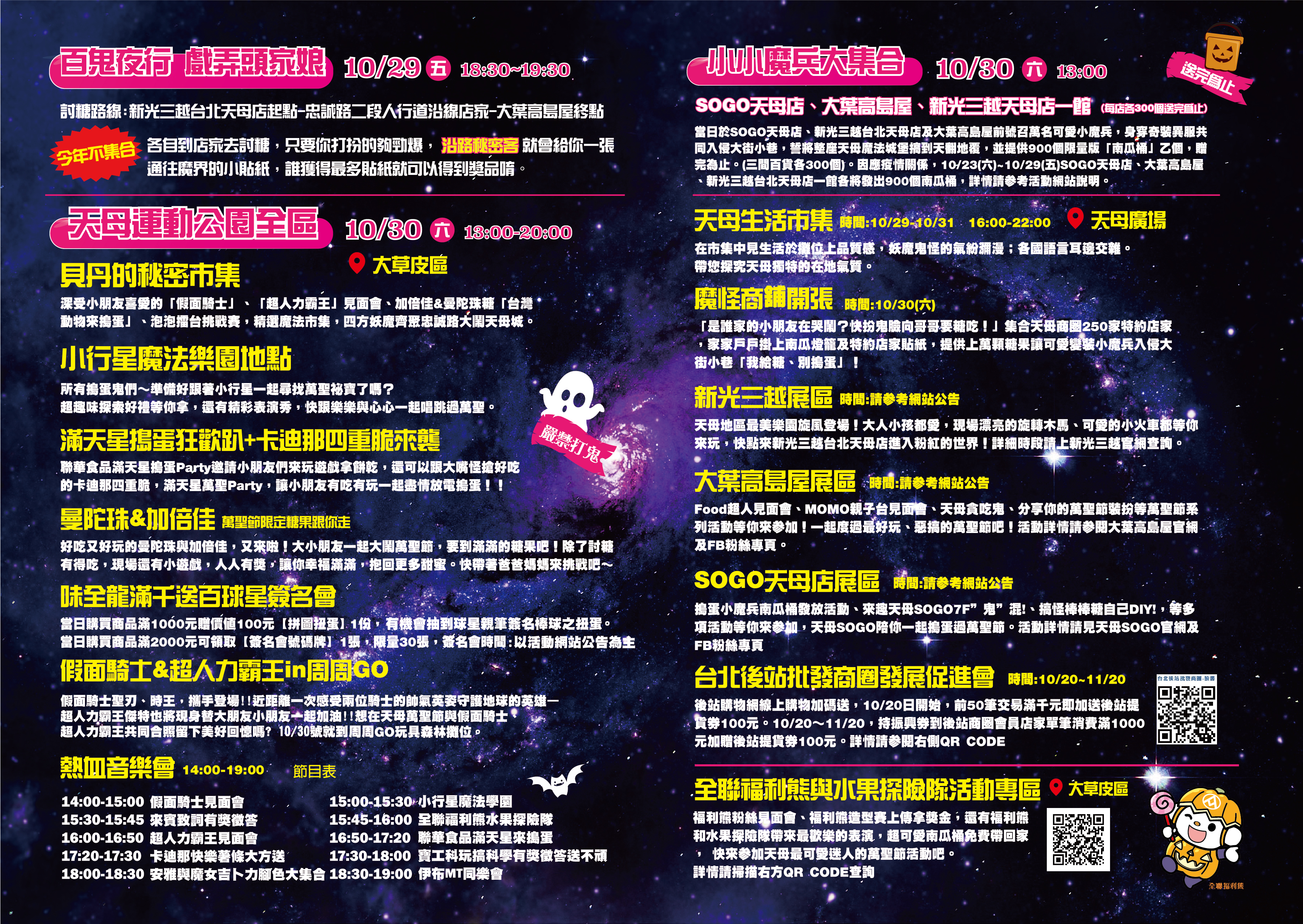 1.10/30星期六下午1:00整於SOGO天母店、新光三越天母店A館、大葉高島屋前集合,請依序排隊領取南瓜桶後開始遊行。