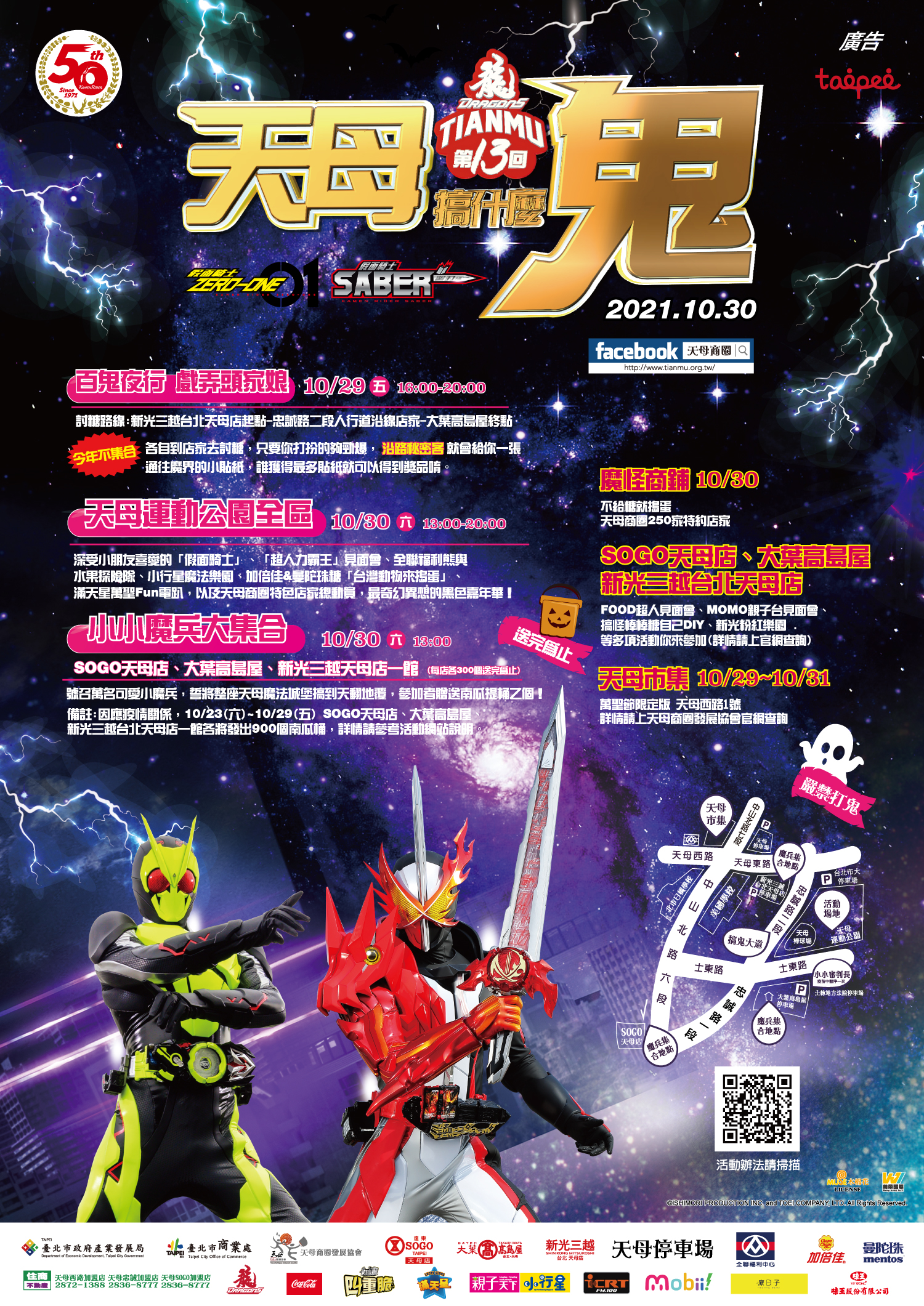 今年邁入第13屆的天母搞什麼鬼活動,由10/29(五)百鬼夜行大鬧天母城打頭陣,由於疫情的關係今年不集合不聚集,四方妖魔鬼怪吉祥物和民眾與鬼同行。