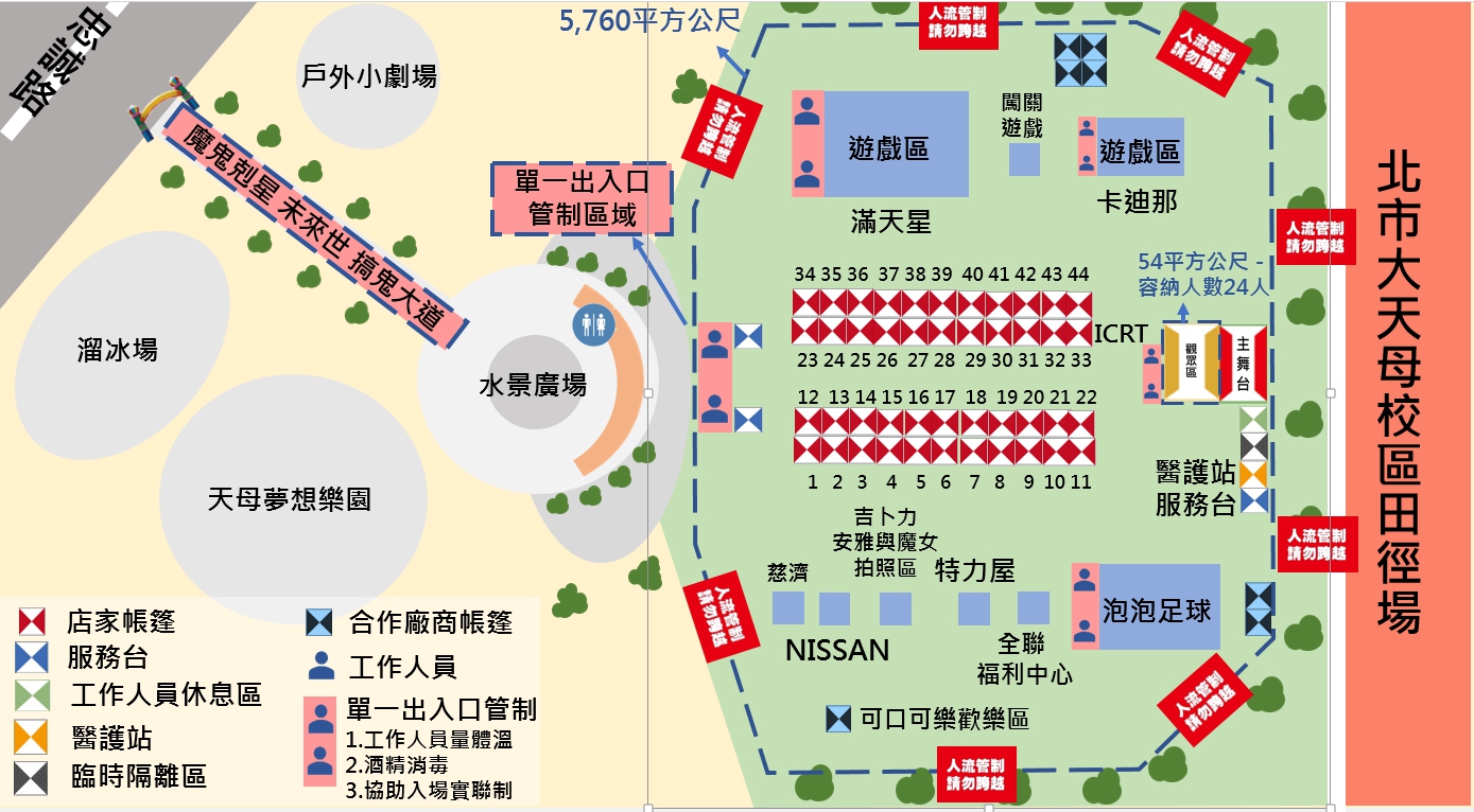 舞台區將進行人流管制,54平方公尺容納24人,採單一出入口一進一出。