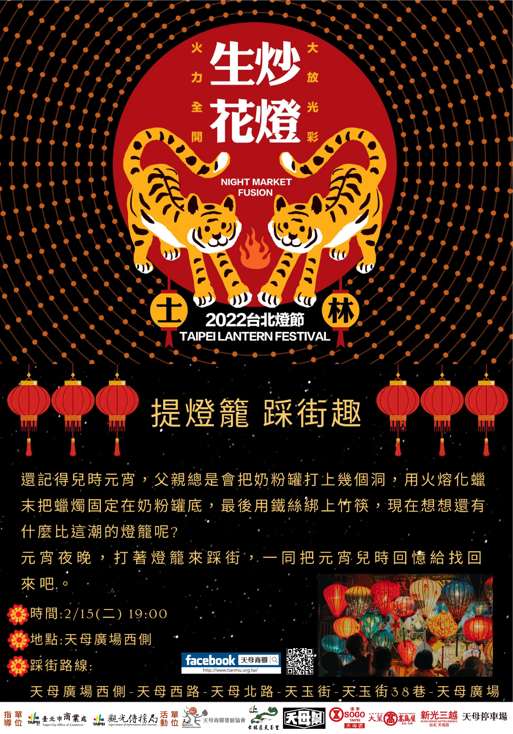 6.踩街服務台開放時間及地點:2022/2/15(二)19:00至21:30,天母廣場西側舞台前帳篷。