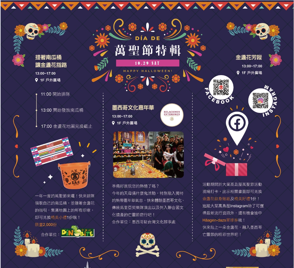 活動期間於大葉髙島屋萬聖節活動現場打卡,出示相關畫面即可兌換金盞花紋身貼紙及精美好禮一份,追蹤大葉髙島屋Instagram除了可獲得最新流行資訊外,還有機會抽中Häagen-dazs單球券哦!快來貼上一朵金盞花,融入墨西哥亡靈節的精彩世界吧!