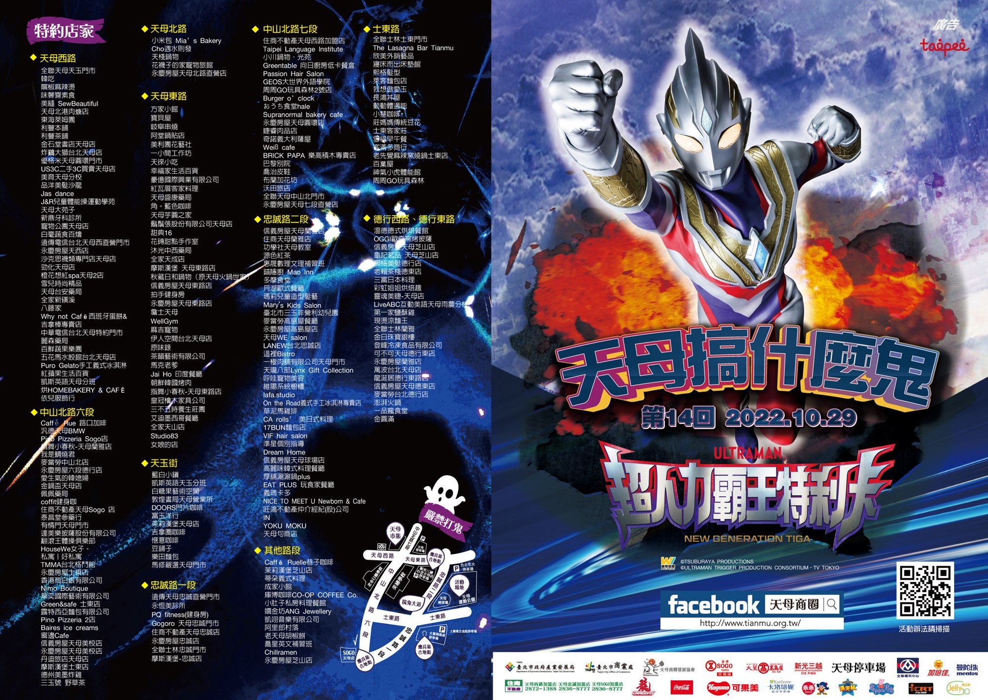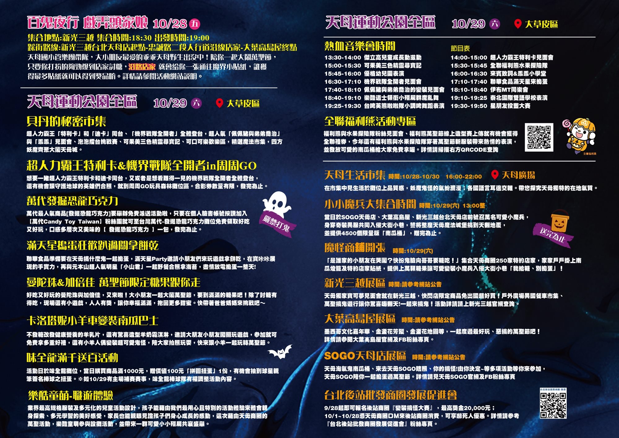 10/29(六)活動現場邀請深受小朋友喜愛的日本「超人力霸王特利卡、迪卡」、「機界戰隊全開者」和「佩佩豬與弟弟喬治」一同和大家見面。四方妖魔鬼怪齊聚忠誠路大鬧天母城,一同享用魔鬼套餐忘情水、一年一次相聚闔家歡樂話家常。