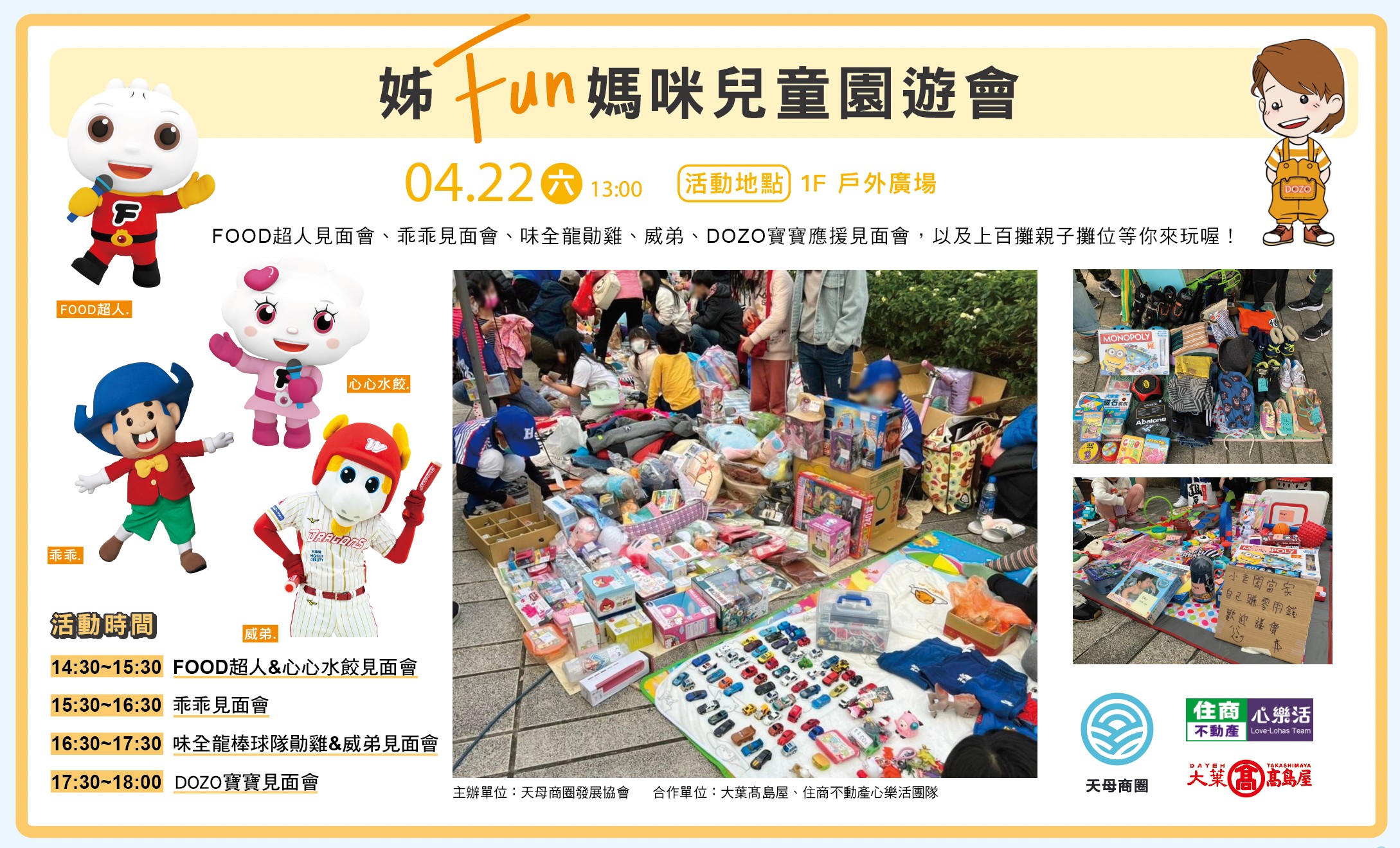 每月舉辦一次的天母市集主題日-媽媽親子小老闆二手市集,四月份特別與天母大葉高島屋百貨公司合作,將於4/22(六)於大葉高島屋前廣場舉辦,現場並邀請FODD超人&心心水餃、乖乖、味全龍棒球隊應援隊長勛雞&威弟、dozo寶寶來到現場與大家見面。