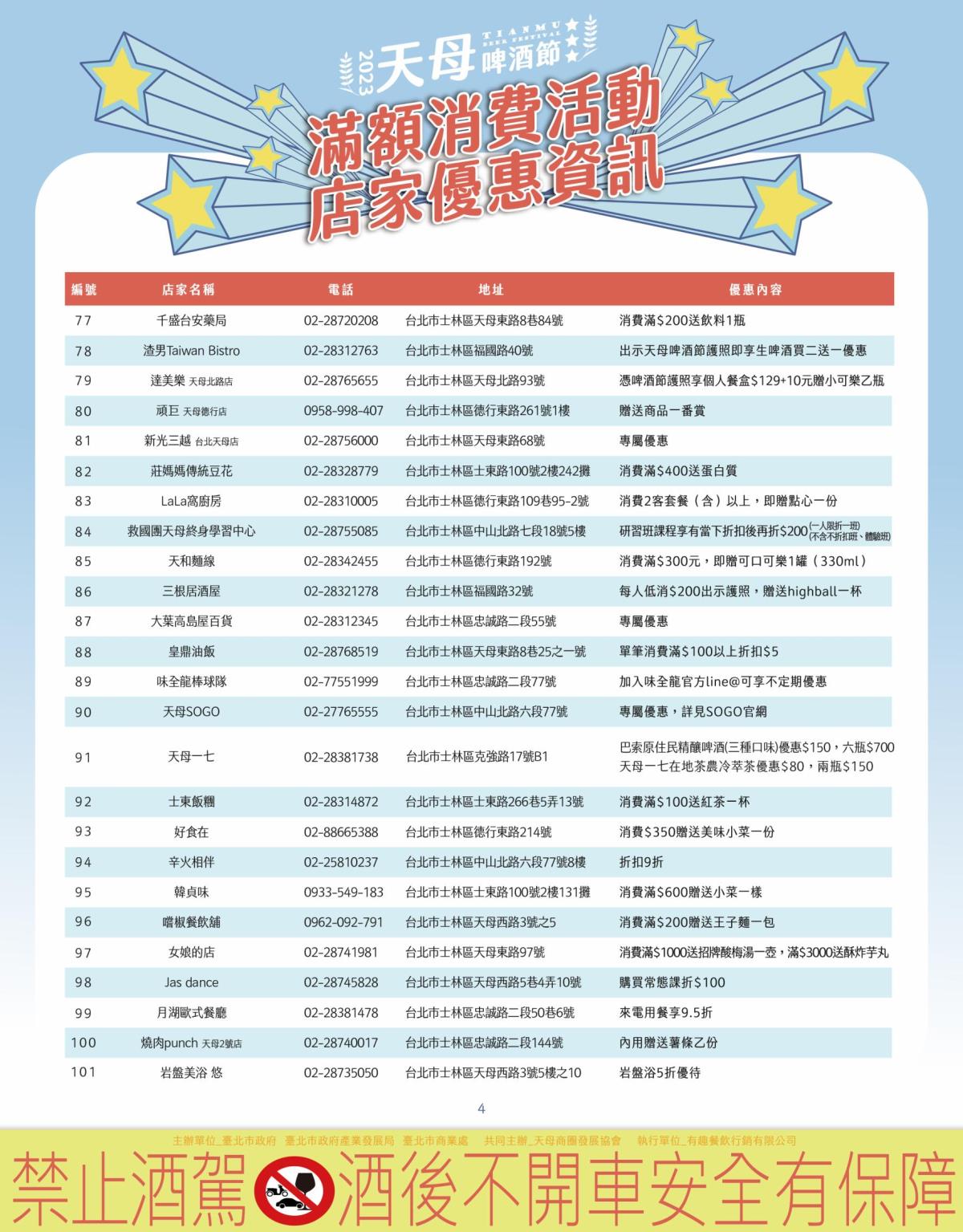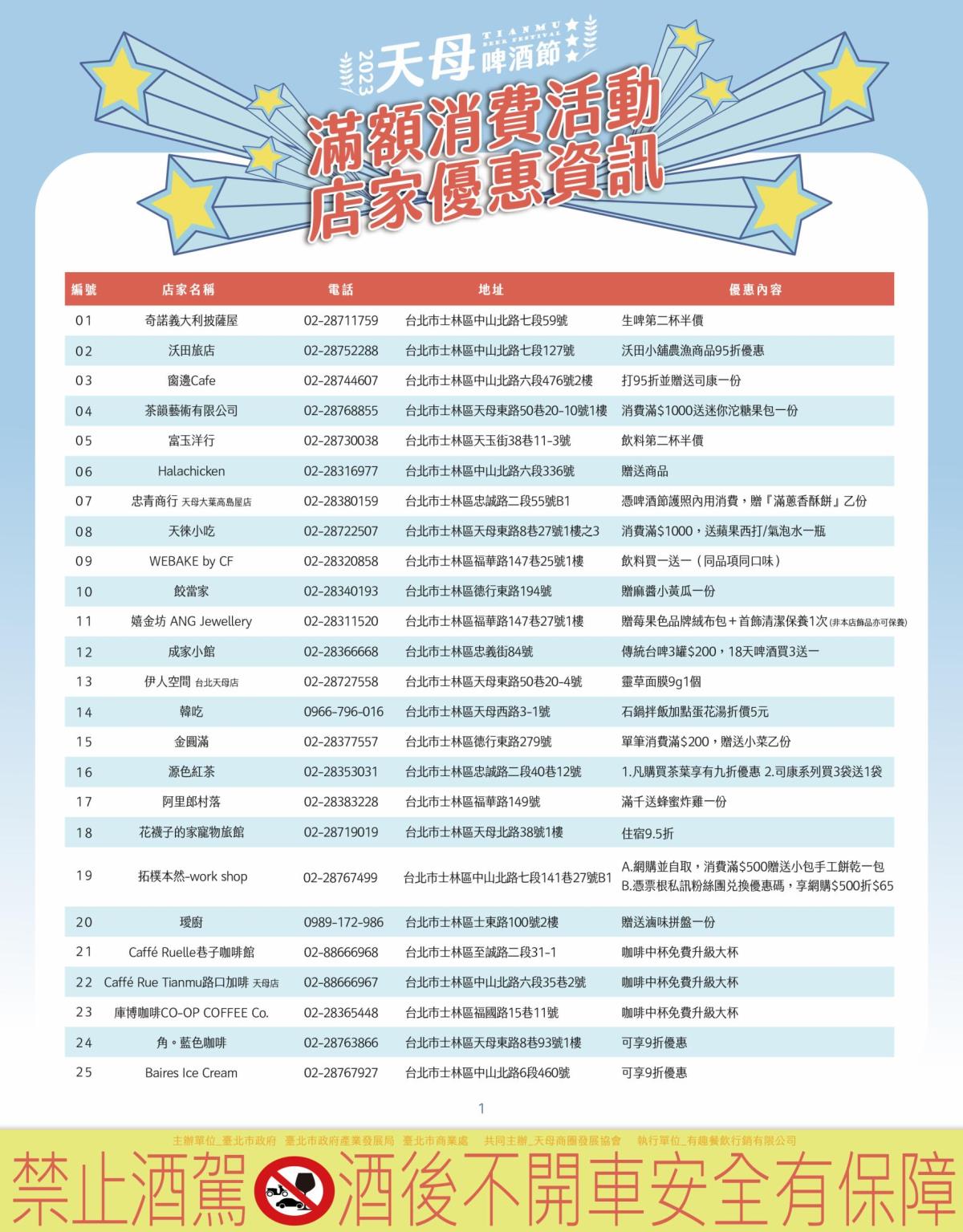 本次活動也與台灣代駕、yoxi、55688代駕合作,推出7/22、7/23活動限定優惠方案,於台灣代駕APP輸入優惠碼「2023BEER」即獲得100元折抵,更提供現場免費雙北代駕每日3組名額;而 yoxi 以 APP 做為呼叫計程車平台,更針對天母啤酒節活動,特別設定不論新舊客戶,在其 APP 輸入折扣碼「天母啤酒節」即送100元搭車金;另外下載台灣大車隊55688APP,輸入優惠碼「BEER330」,即送55688代駕$330元代駕折價券,使民眾開心飲酒也能安全回家!