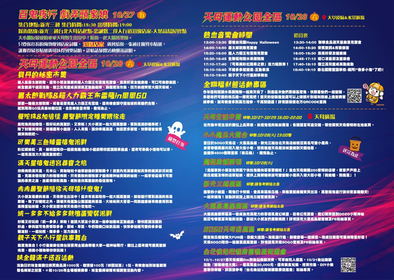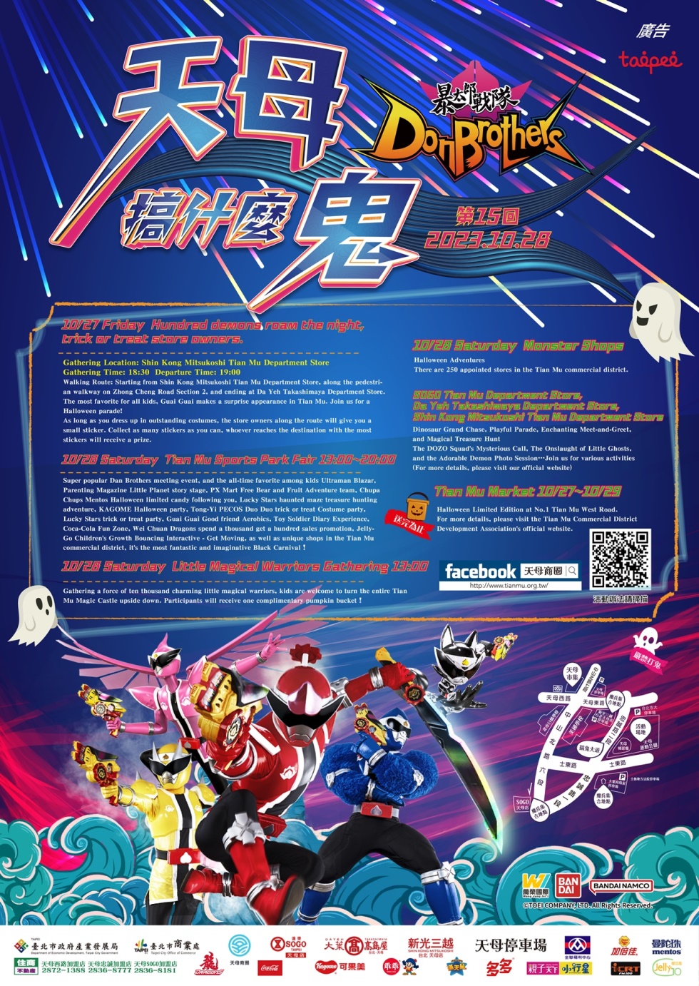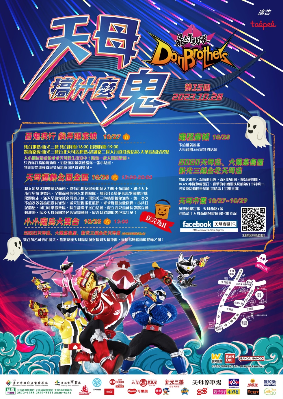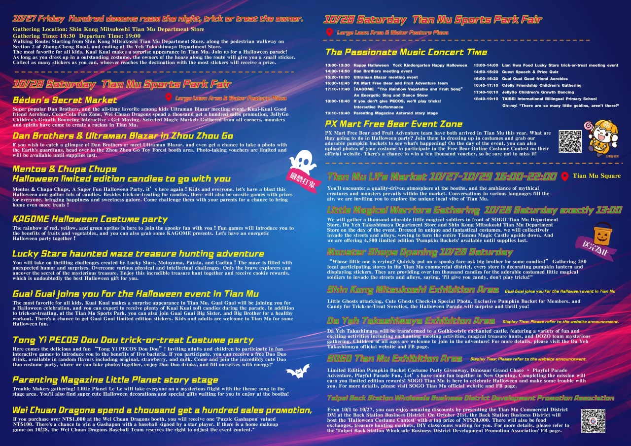10/28(六)活動現場邀請深受小朋友喜愛的日本「暴太郎戰隊」、「超人力霸王布雷薩」、「滿天星搗蛋見面會」、「乖乖」、「可果美三色精靈」一同和大家見面。四方妖魔鬼怪齊聚忠誠路大鬧天母城,一同享用魔鬼套餐忘情水、一年一次相聚闔家歡樂話家常。