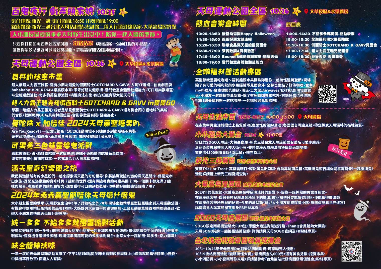 1.10/26(六)下午1:00整於SOGO天母店、大葉高島屋、新光三越台北天母店1館前集合,請依序排隊領取南瓜桶後開始遊行。
