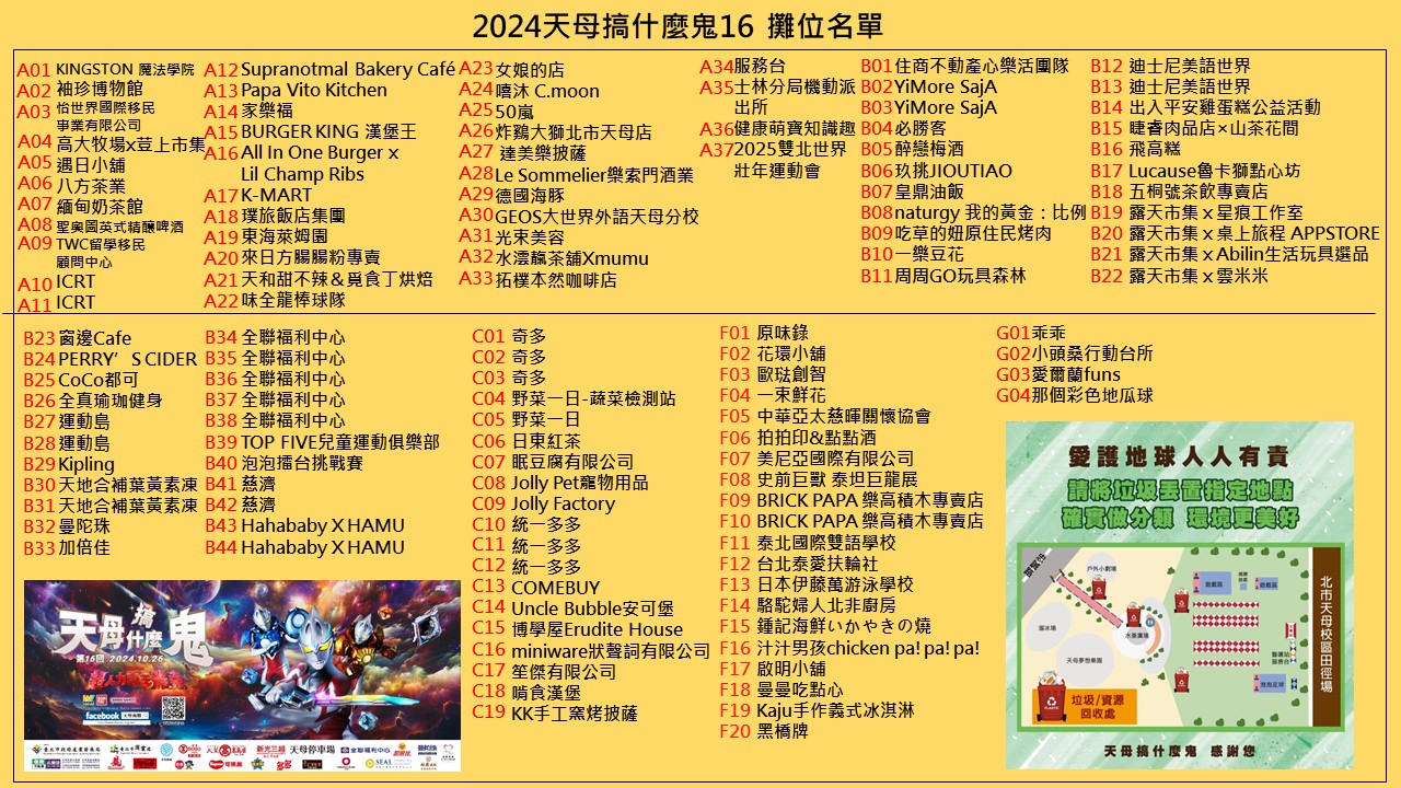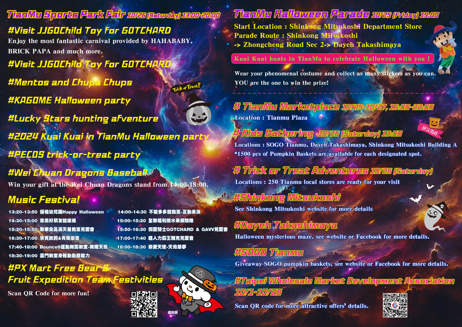超人氣超人力霸王雅客、還有小朋友最愛的假面騎士GOTCHARD & GAVV,BRICK PAPA樂高積木車,乖乖好朋友健康操、雲門教室身體動動超能力、可口可樂歡樂區、味全龍遊戲活動,奇多豹萬聖節派對等多項活動。天母商圈特色店家總動員,超過40家特色店家參與,無現金支付也能消費,超驚嚇萬聖節限定商品、搞鬼搞怪神秘魔法水,超擬真恐怖珍饌、超驚萬聖節限定商品,給你最上乘的秘密市集!