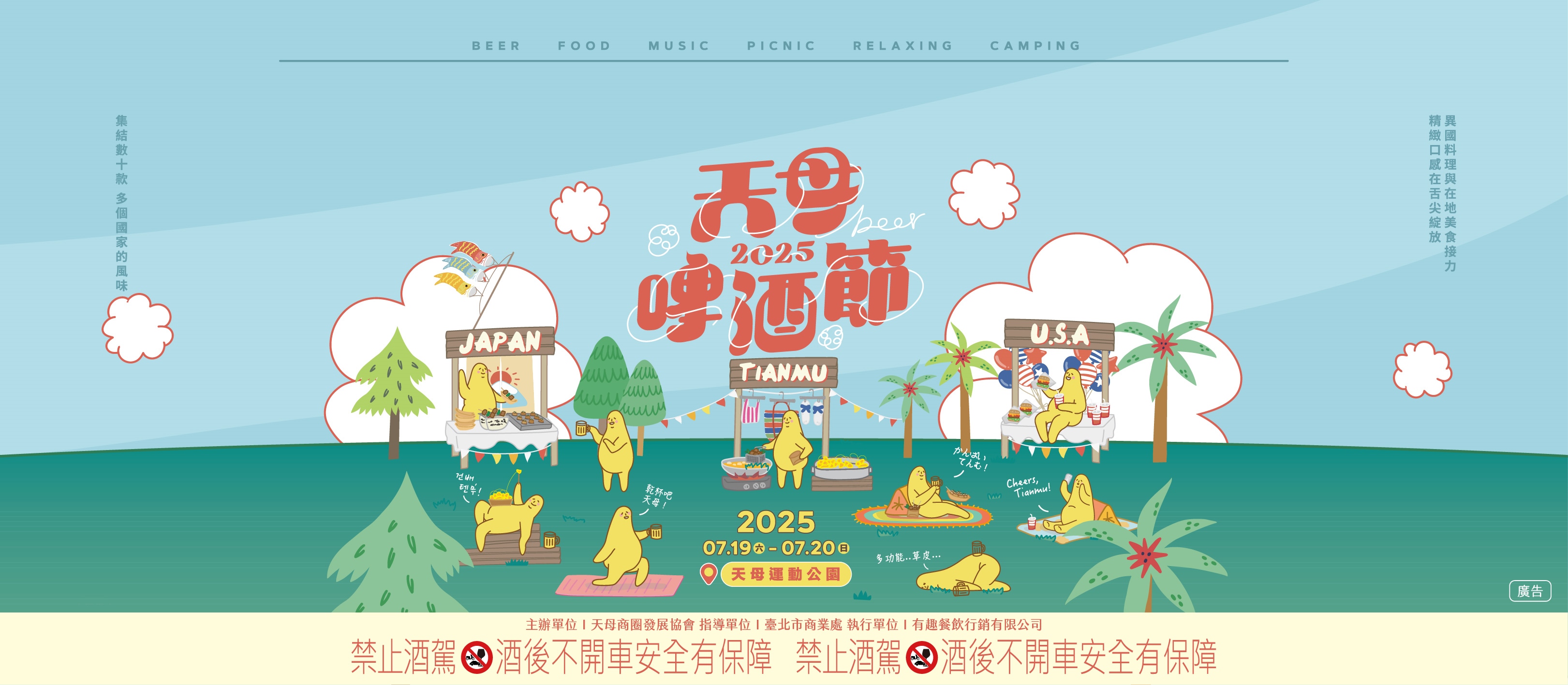 主場活動會在7月19日、20日在天母運動公園熱鬧登場,力邀人氣歌手輪番上陣熱力開唱,現場還有百款啤酒及人氣美食任君選購,將歡樂的夏日派對帶進天母,邀請喜愛啤酒、美食民眾,一同走出戶外前來享受最CHILLAX的週末。