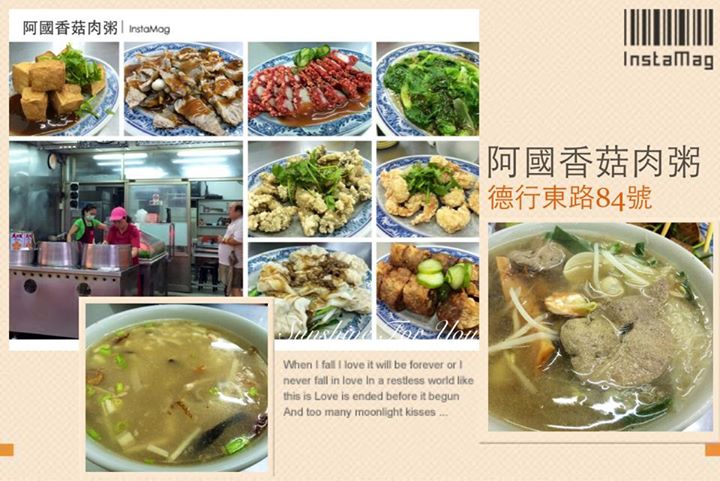 總聽到有人對天母的餐廳都早早打烊略有微詞。如果晚上突然肚子餓,或想和幾個朋友找個地方吃東西、聊聊天,特派員推薦不妨來阿國香菇肉粥坐坐。