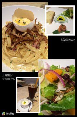 這回特派員吃的是上青攬月義大利麵,看MENU介紹食材時,特派員直覺就是奶油培根義大利麵。想不到餐點端上後,新鮮雞蛋還在蛋殻裡,要自己倒進麵裡拌一拌再吃,讓吃飯變得更有趣了!