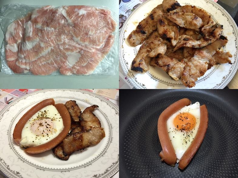 前幾天特別跑去買了五片「松阪豬」的部位,因為早早就賣完了,只好留下電話預訂隔天就可以取貨,店家還會幫你分切包好分成五包,之後跑去大葉高島屋超市買味磳醃一個晚上,隔天再放上平底鍋煎一煎就好了,另外還有賣一些如水餃、貢丸之類的加工品,圖中就是德式香腸,回家做點變化就變成這樣了。