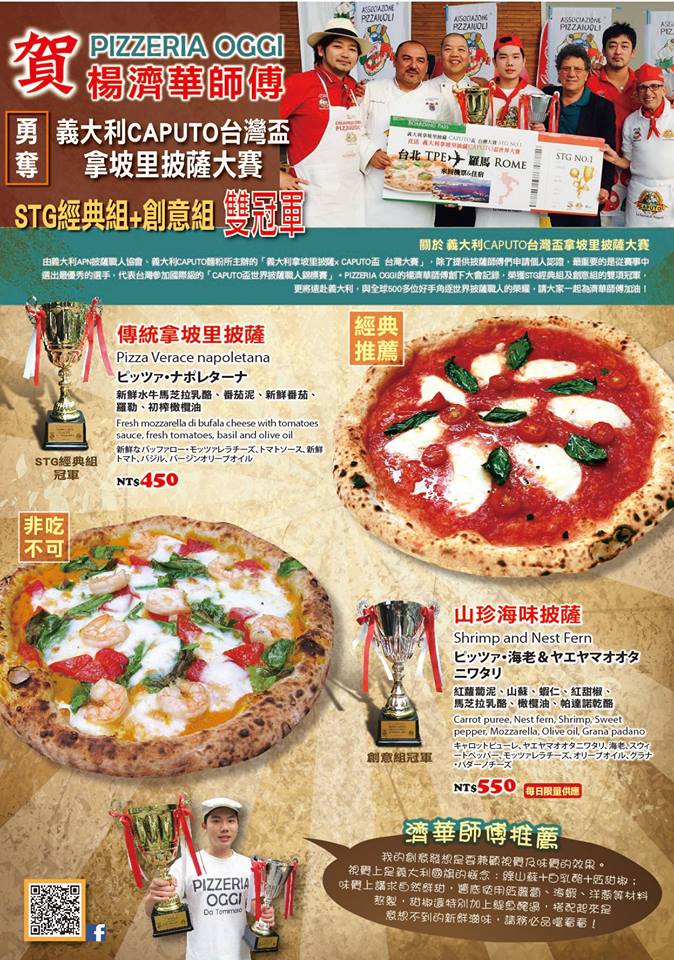 PIZZERIA OGGI天母店是台灣第一家榮獲AVPN(拿坡里披薩協會)認證的披薩專賣店,在認證的光環之後,近期又再添榮耀!店裡的楊濟華師傅參加「2015義大利拿坡里披薩x CAPUTO盃 台灣大賽」,在眾多優秀的選手中拔得頭籌,勇奪STG經典組及創意組的雙料冠軍!