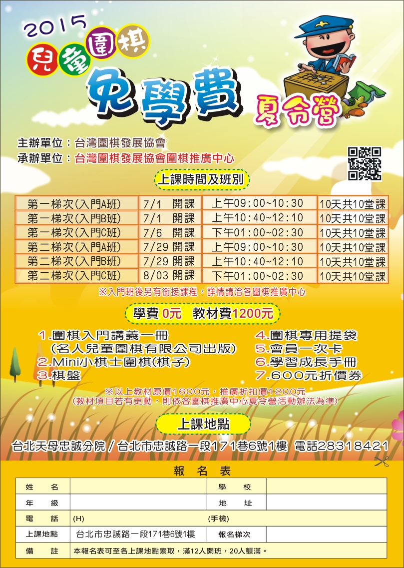 名人兒童圍棋天母分院所屬的台灣圍棋發展協會每年寒暑假皆有免學費(只收教材費)的推廣課程,歡迎各位小朋友報名參加。