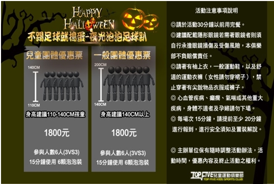 號朝大魔鬼小魔鬼相招來一起同樂最夯的泡泡足球,只要六個人即可報名參加喔!!