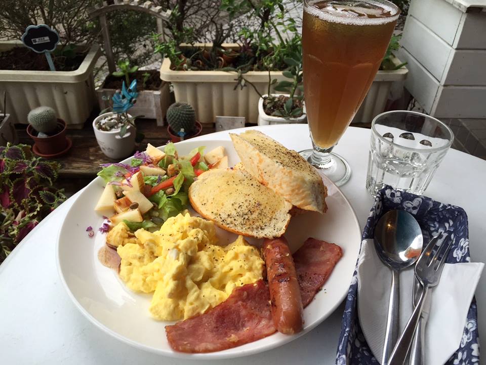 因為已經吃完早餐的關係肚子還有點飽,但總不能只點一杯咖啡來介紹,菜單翻來翻去也不知道點什麼,礙於平常在家當小弟當習慣了,就挑選了國王早餐來嘗嘗,國王早餐包含法式軟法、培根、香腸、莎拉及咖啡、紅綠茶選一,今早就在芝山岩下當個小文青吧。