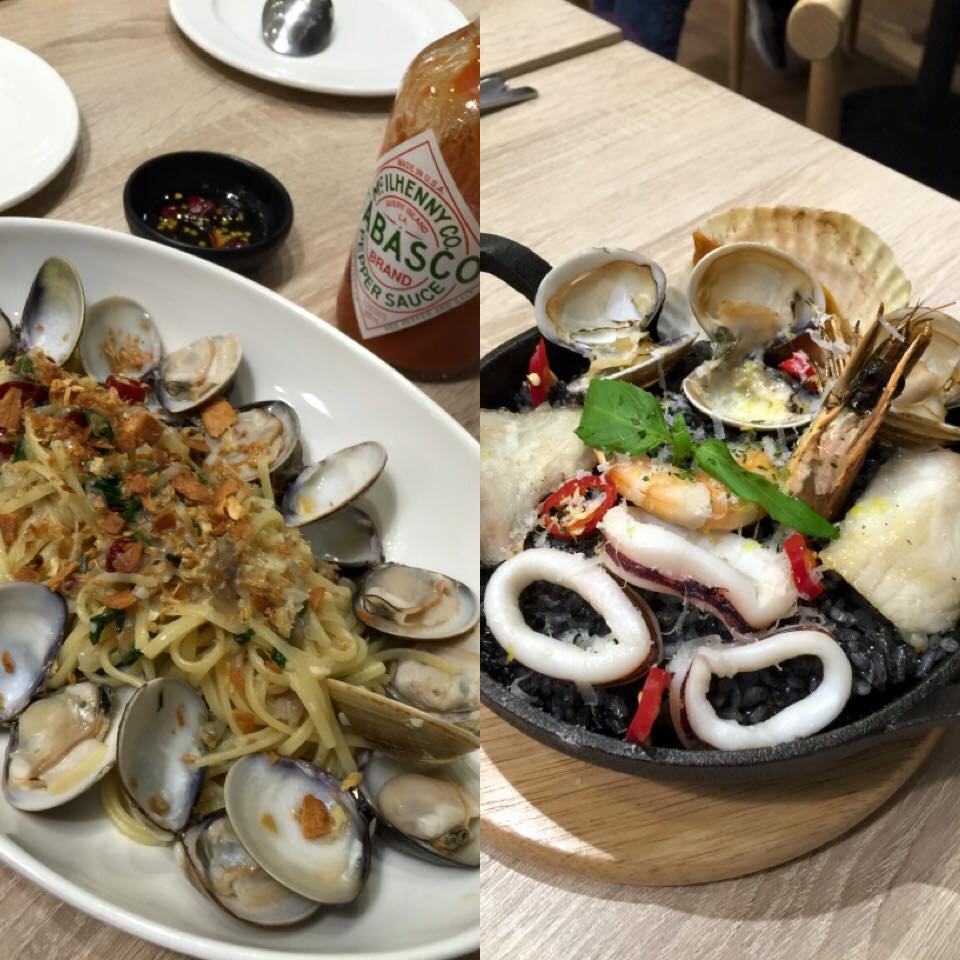 烤飯吃起來跟燉飯有點像,墨魚香氣很濃郁,鋪在上面的海鮮很豪邁,還有一顆大扇貝,另外點的微辣蒜味蛤蠣扁細麵也很棒,蛤蠣共有11顆每顆肥美又多汁,光是看圖就很想吃了吧!