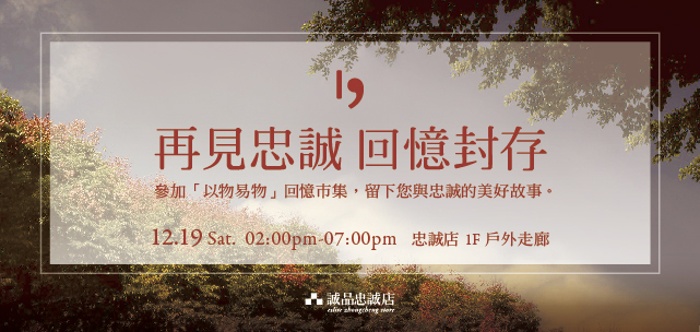 忠誠店走過19年,各個角落散落著19年的歷史與故事,近年來舉辦「忠誠走廊市集」邀請社區居民與文創產業,一同提供天母地區更多樣文化與生活交流的友善空間。記憶猶新,光陰荏苒。誠品邀請您一同來參與最後一次的回憶市集。帶著您與心愛物品的回憶,來這個與人們交換故事的所在,故事無價,回憶永存!以「以物易物」方式,將它帶回家好好收藏。