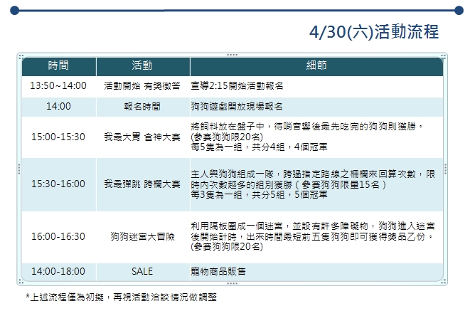 (二)現場投票:活動當天欲參加投票者可與現場工作人員領取投票貼紙及抽獎券乙張,投票時間為下午3點至5點,投票還能抽驚喜好禮!快來選出你最喜歡的狗狗吧!現場投票占整體分數40%。