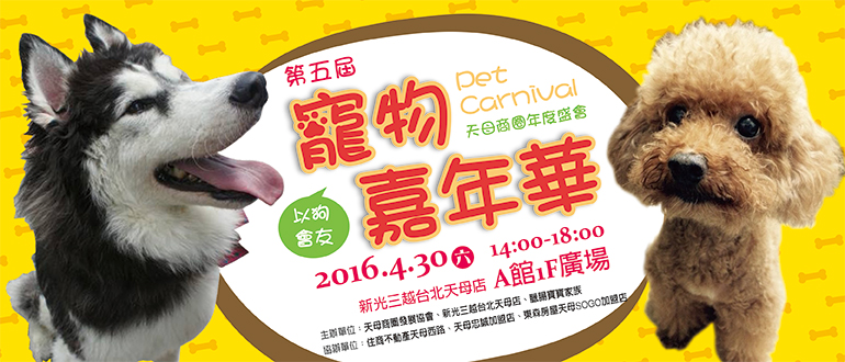 活動宗旨:天母地區飼養寵物的民眾非常的多,相對寵物相關業種的店家比利也相對較高,天母商圈發展協會將於4/30星期六於新光三越台北天母店前廣場,以動物為主題發起舉辦第五屆「以狗會友」活動,以往前四屆天母商圈寵物嘉年華每屆吸引將近三千人參與活動,現場非常熱鬧,希望藉由這樣的活動號召大台北地區的民眾攜帶寵物共同參與。