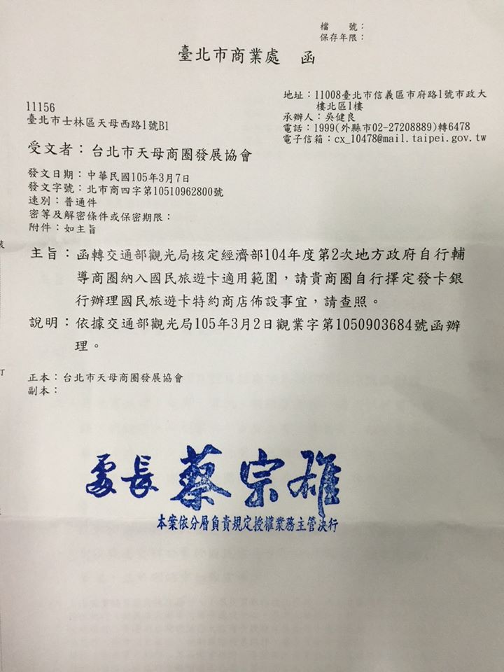 協會公告 : 天母商圈國民旅遊卡店家範圍擴大申請案已經通過了