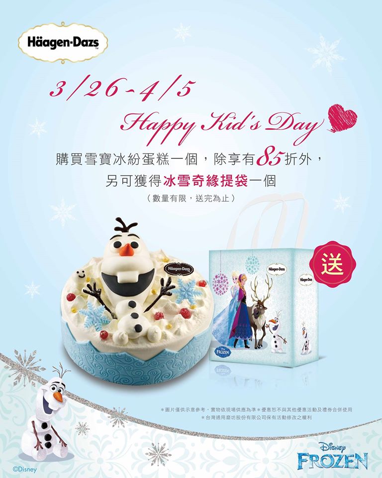 今年兒童節蛋糕首選,快讓可愛的雪寶蛋糕陪伴大家度過兒童節,購買雪寶蛋糕即享85折即贈送冰雪奇緣提袋,趕快到天母店把雪寶蛋糕帶回家吧!