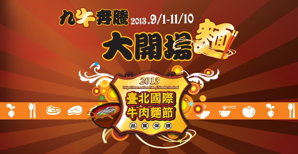 「2013臺北國際牛肉麵節」今(29)日宣佈開跑,自9/1起將陸續推出「遇見‧牛肉麵」徵文評選、「全國大開嚐麵」聯合行銷優惠、「廚神爭霸賽」、「國際名廚邀請賽」等,最後並由11/9-10於臺北圓山花博公園舉辦的「九牛奔騰‧大開場麵嘉年華會」壓軸登場,將帶給市民一個濃郁的牛肉麵饗宴。